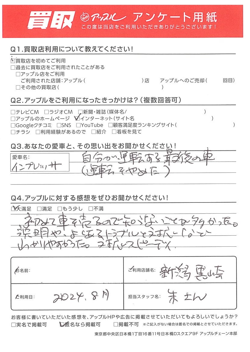 お車のご相談・ 査定だけでもOK! カンタン 入力 30秒 アップルがブランド買取始めました! お電話でも受付中! 受付時間10:00 ~ 18:30 0120-556-522 お車のご相談・ 査定だけでもOK! カンタン 入力 30秒 アップルがブランド買取始めました! お電話でも受付中! 受付時間10:00 ~ 18:30 0120-556-522 アップルがブランド買取始めました! お電話でも受付中! 受付時間10:00 ~ 18:30 0120-556-522 店舗情報 在庫車 スタッフ紹介 ブログ お客様の声 キャンペーン お得 無料査定 click お客様の声 ご記入日: 2024/08/22 N様 車名:スバル インプレッサスポーツワゴン 初めて車を売るので知らないことが多かった。説明や、よくあるトラブルや対応など、わかりやすかった。対応スピーディ。 前へ 次へ お客様の声一覧を見る