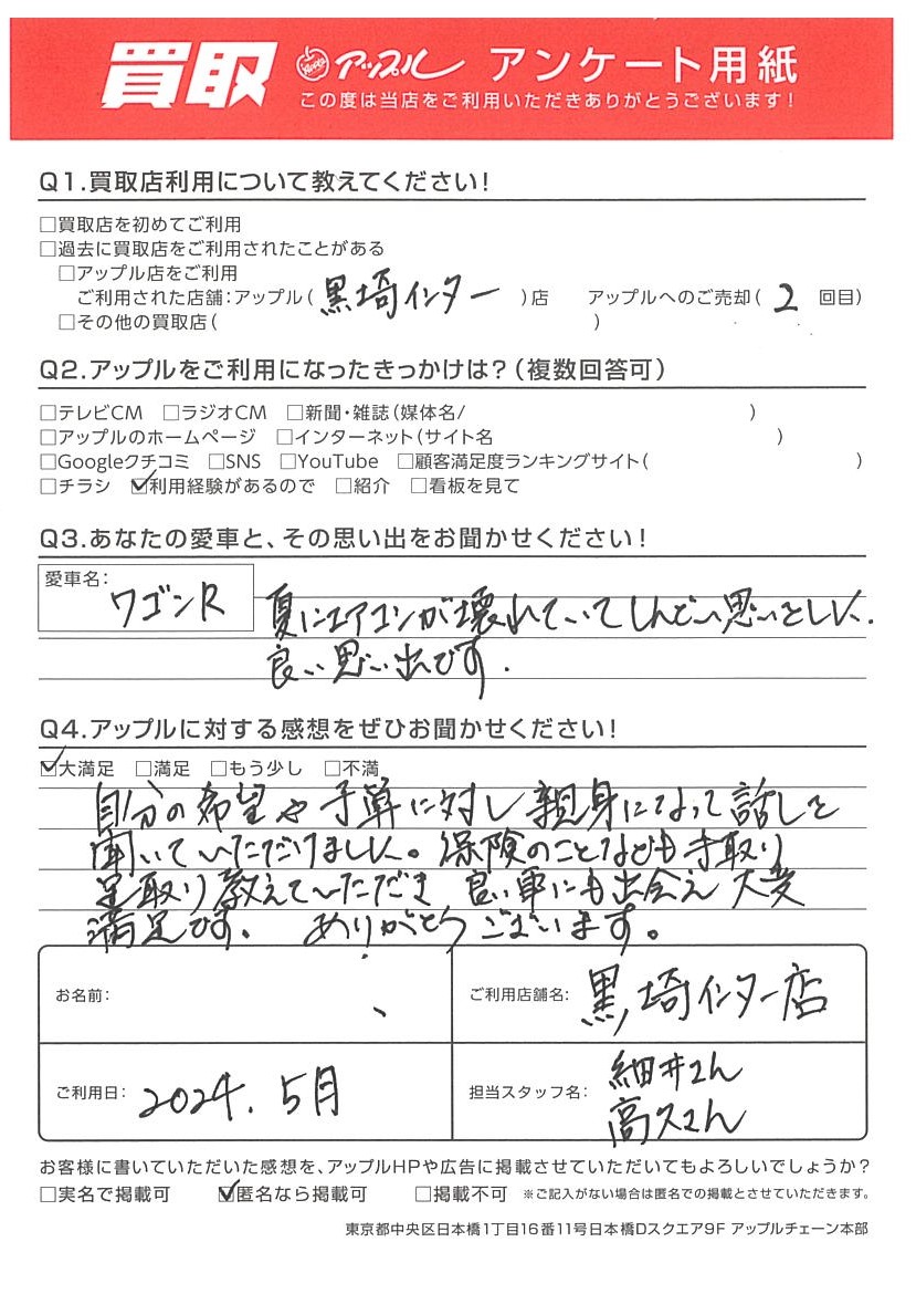 お車のご相談・ 査定だけでもOK! カンタン 入力 30秒 アップルがブランド買取始めました! お電話でも受付中! 受付時間10:00 ~ 18:30 0120-556-522 お車のご相談・ 査定だけでもOK! カンタン 入力 30秒 アップルがブランド買取始めました! お電話でも受付中! 受付時間10:00 ~ 18:30 0120-556-522 アップルがブランド買取始めました! お電話でも受付中! 受付時間10:00 ~ 18:30 0120-556-522 店舗情報 在庫車 スタッフ紹介 ブログ お客様の声 キャンペーン お得 無料査定 click お客様の声 ご記入日: 2024/05/02 W様 車名:スズキ ワゴンR 自分の希望や予算に対し、親身になって話を聞いていただけました。保険のことなども手取り足取り教えていただき、良い車にも出会え大変満足です。ありがとうございます。 前へ 次へ お客様の声一覧を見る