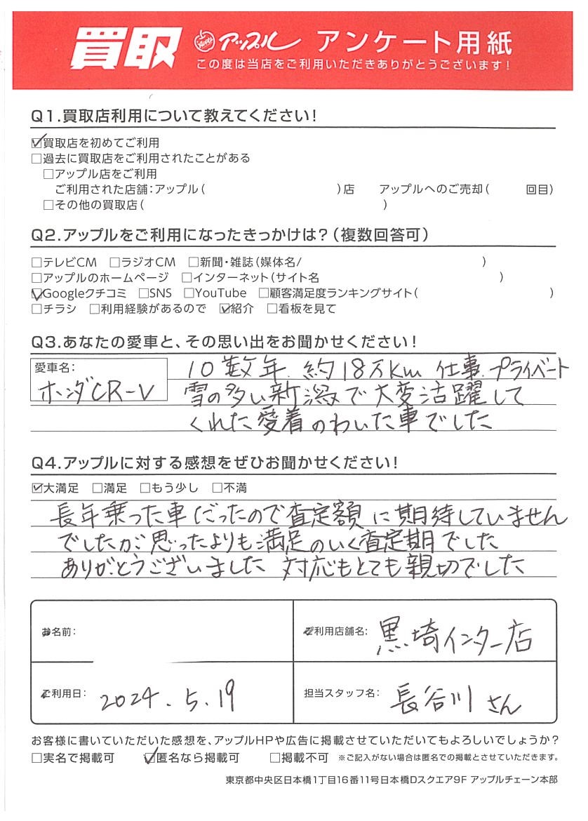 お車のご相談・ 査定だけでもOK! カンタン 入力 30秒 アップルがブランド買取始めました! お電話でも受付中! 受付時間10:00 ~ 18:30 0120-556-522 お車のご相談・ 査定だけでもOK! カンタン 入力 30秒 アップルがブランド買取始めました! お電話でも受付中! 受付時間10:00 ~ 18:30 0120-556-522 アップルがブランド買取始めました! お電話でも受付中! 受付時間10:00 ~ 18:30 0120-556-522 店舗情報 在庫車 スタッフ紹介 ブログ お客様の声 キャンペーン お得 無料査定 click お客様の声 ご記入日: 2024/05/19 U様 車名:ホンダ CR-V 長年乗った車だったので査定額に期待していませんでしたが、思ったよりも満足のいく査定額でした。ありがとうございました。対応もとても親切でした。 前へ 次へ お客様の声一覧を見る