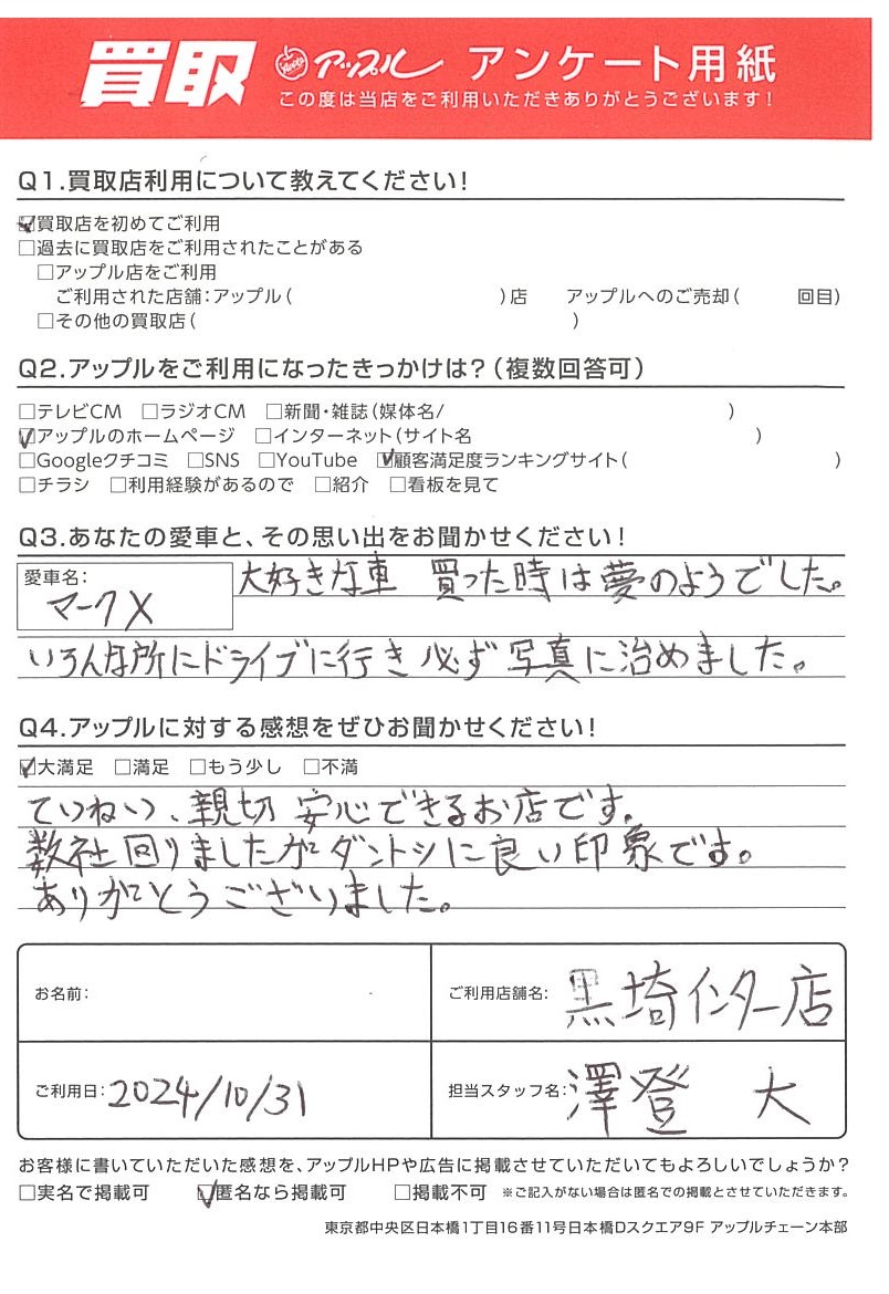 お車のご相談・ 査定だけでもOK! カンタン 入力 30秒 アップルがブランド買取始めました! お電話でも受付中! 受付時間10:00 ~ 18:30 0120-556-522 お車のご相談・ 査定だけでもOK! カンタン 入力 30秒 アップルがブランド買取始めました! お電話でも受付中! 受付時間10:00 ~ 18:30 0120-556-522 アップルがブランド買取始めました! お電話でも受付中! 受付時間10:00 ~ 18:30 0120-556-522 店舗情報 在庫車 スタッフ紹介 ブログ お客様の声 キャンペーン お得 無料査定 click お客様の声 ご記入日: 2024/10/31 K様 車名:トヨタ マークX 丁寧、親切、安心できるお店です。数社回りましたがダントツに良い印象です。ありがとうございました。 前へ 次へ お客様の声一覧を見る