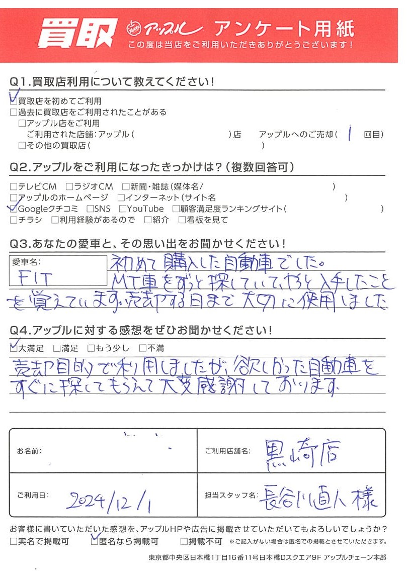 お車のご相談・ 査定だけでもOK! カンタン 入力 30秒 アップルがブランド買取始めました! お電話でも受付中! 受付時間10:00 ~ 18:30 0120-556-522 お車のご相談・ 査定だけでもOK! カンタン 入力 30秒 アップルがブランド買取始めました! お電話でも受付中! 受付時間10:00 ~ 18:30 0120-556-522 アップルがブランド買取始めました! お電話でも受付中! 受付時間10:00 ~ 18:30 0120-556-522 店舗情報 在庫車 スタッフ紹介 ブログ お客様の声 キャンペーン お得 無料査定 click お客様の声 ご記入日: 2024/12/01 Y様 車名:ホンダ フィット(H25年9月以降のハイブリッド含む) 売却目的で利用しましたが、欲しかった自動車をすぐに探してもらえて大変感謝しております。 前へ 次へ お客様の声一覧を見る