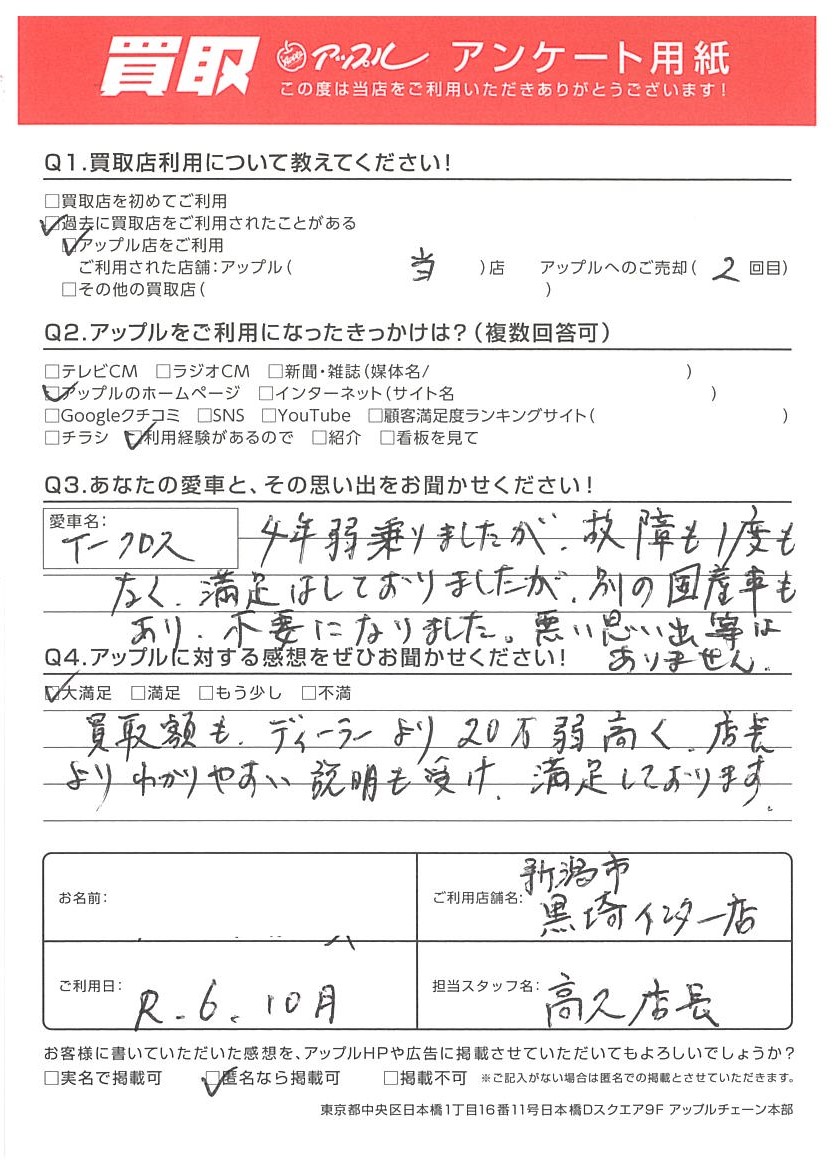 お車のご相談・ 査定だけでもOK! カンタン 入力 30秒 アップルがブランド買取始めました! お電話でも受付中! 受付時間10:00 ~ 18:30 0120-556-522 お車のご相談・ 査定だけでもOK! カンタン 入力 30秒 アップルがブランド買取始めました! お電話でも受付中! 受付時間10:00 ~ 18:30 0120-556-522 アップルがブランド買取始めました! お電話でも受付中! 受付時間10:00 ~ 18:30 0120-556-522 店舗情報 在庫車 スタッフ紹介 ブログ お客様の声 キャンペーン お得 無料査定 click お客様の声 ご記入日: 2024/10/08 S様 車名:フォルクスワーゲン T-Cross 買取額も、ディーラーより20万弱高く、店長よりわかりやすい説明も受け、満足しております。 前へ 次へ お客様の声一覧を見る
