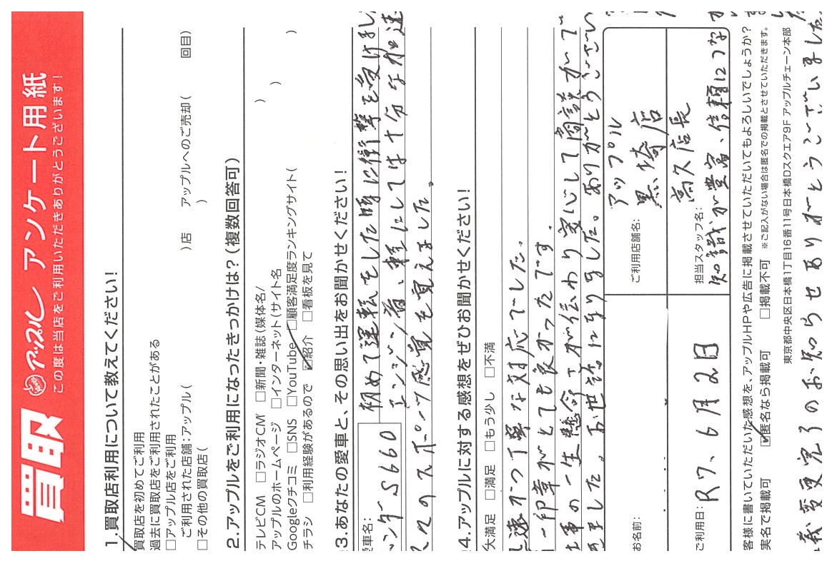お車のご相談・ 査定だけでもOK! カンタン 入力 30秒 アップルがブランド買取始めました! お電話でも受付中! 受付時間10:00 ~ 18:30 0120-556-522 お車のご相談・ 査定だけでもOK! カンタン 入力 30秒 アップルがブランド買取始めました! お電話でも受付中! 受付時間10:00 ~ 18:30 0120-556-522 アップルがブランド買取始めました! お電話でも受付中! 受付時間10:00 ~ 18:30 0120-556-522 店舗情報 在庫車 スタッフ紹介 ブログ お客様の声 キャンペーン お得 無料査定 click お客様の声 ご記入日: 2025/06/02 新潟県新潟市 M様 車名:ホンダ S660 迅速かつ丁寧な対応でした。第一印象がとても良かったです。仕事の一生懸命さが伝わり安心して商談ができました。お世話になりました。ありがとうございました。 前へ 次へ お客様の声一覧を見る