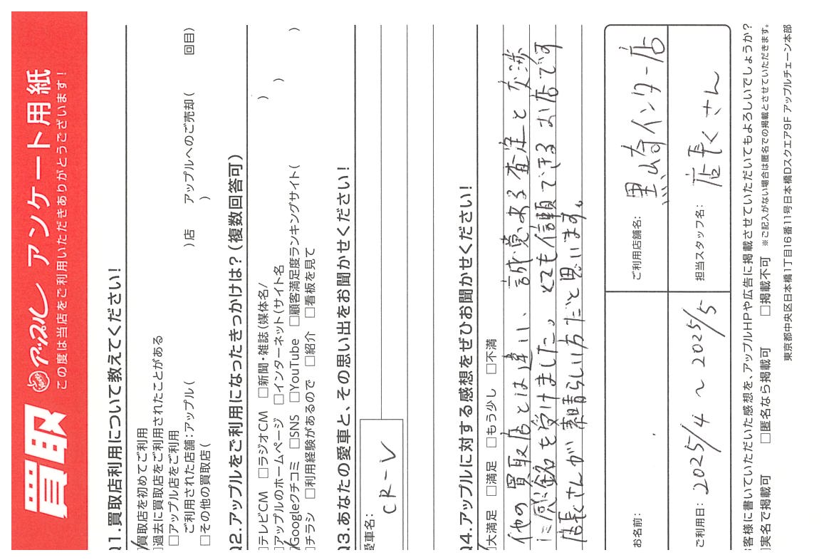 お車のご相談・ 査定だけでもOK! カンタン 入力 30秒 アップルがブランド買取始めました! お電話でも受付中! 受付時間10:00 ~ 18:30 0120-556-522 お車のご相談・ 査定だけでもOK! カンタン 入力 30秒 アップルがブランド買取始めました! お電話でも受付中! 受付時間10:00 ~ 18:30 0120-556-522 アップルがブランド買取始めました! お電話でも受付中! 受付時間10:00 ~ 18:30 0120-556-522 店舗情報 在庫車 スタッフ紹介 ブログ お客様の声 キャンペーン お得 無料査定 click お客様の声 ご記入日: 2025/04/30 新潟県新潟市 T様 車名:ホンダ CR-V 他の買取店とは違い、誠意ある査定と交渉に感銘を受けました。とても信頼できるお店です。店長さんが素晴らしい方だとおもいます。 前へ 次へ お客様の声一覧を見る
