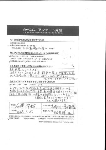 アップルさんでお世話になったのは今回で3回目。いつも本当に良くしてもらってます。車買い取りの裏話も教えてくれたり・・。細井さんは掛け値なしで満足できる金額を出してくれる人!!人間的に裏表なくてサイコーです!!また、お願いします!!