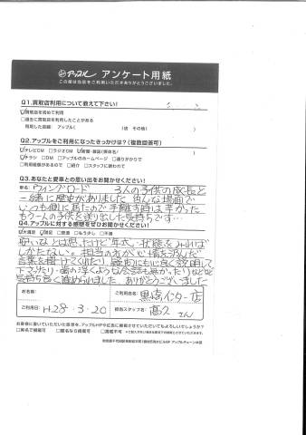 安いなとは思ったけど年式・状態を見ればしかたない。担当の方が心情を汲んだ言葉を掛けてくれたり、疑問にも心良く説明してくださったり、歯の浮くような会話も無かったりなどなど気持ち良く進められました。ありがとうございました。