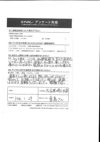 お車のご相談・ 査定だけでもOK! カンタン 入力 30秒 アップルがブランド買取始めました! お電話でも受付中! 受付時間10:00 ~ 18:30 0120-556-522 お車のご相談・ 査定だけでもOK! カンタン 入力 30秒 アップルがブランド買取始めました! お電話でも受付中! 受付時間10:00 ~ 18:30 0120-556-522 アップルがブランド買取始めました! お電話でも受付中! 受付時間10:00 ~ 18:30 0120-556-522 店舗情報 在庫車 スタッフ紹介 ブログ お客様の声 キャンペーン お得 無料査定 click お客様の声 ご記入日: 2018/03/21 T様 フィット君はいつも私達家族を支えてくれました。いっぱい走ってくれて、安全に私たちを楽しい所へ連れて行ってくれました。家族のひとつのかくれ場でした。倉島さんの車に対する熱い思いが伝わり安心してお願いできました。雪の中遠路はるばる有難うございました。感謝です。 前へ 次へ お客様の声一覧を見る