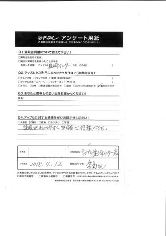 お車のご相談・ 査定だけでもOK! カンタン 入力 30秒 アップルがブランド買取始めました! お電話でも受付中! 受付時間10:00 ~ 18:30 0120-556-522 お車のご相談・ 査定だけでもOK! カンタン 入力 30秒 アップルがブランド買取始めました! お電話でも受付中! 受付時間10:00 ~ 18:30 0120-556-522 アップルがブランド買取始めました! お電話でも受付中! 受付時間10:00 ~ 18:30 0120-556-522 店舗情報 在庫車 スタッフ紹介 ブログ お客様の声 キャンペーン お得 無料査定 click お客様の声 ご記入日: 2018/07/24 Y様 説明がわかりやすく、的確で信頼できた 前へ 次へ お客様の声一覧を見る