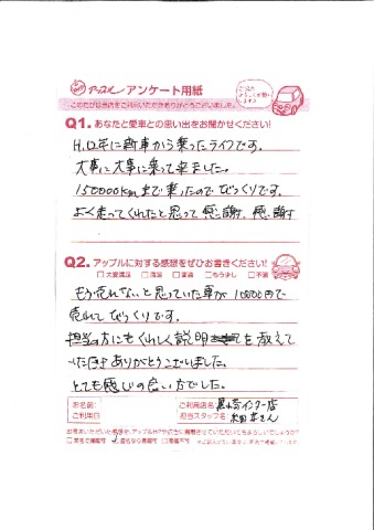 お車のご相談・ 査定だけでもOK! カンタン 入力 30秒 アップルがブランド買取始めました! お電話でも受付中! 受付時間10:00 ~ 18:30 0120-556-522 お車のご相談・ 査定だけでもOK! カンタン 入力 30秒 アップルがブランド買取始めました! お電話でも受付中! 受付時間10:00 ~ 18:30 0120-556-522 アップルがブランド買取始めました! お電話でも受付中! 受付時間10:00 ~ 18:30 0120-556-522 店舗情報 在庫車 スタッフ紹介 ブログ お客様の声 キャンペーン お得 無料査定 click お客様の声 ご記入日: 2013/07/05 S様 H12年に新車から乗ったライフです。大事に大事に乗って来ました。150,000㎞まで乗ったので、びっくりです。よく走ってくれたと思って感謝、感謝。もう売れないと思っていた車が10,000円で売れてびっくりです。担当の方にもくわしく説明を教えていただきありがとうございました。とても感じの良い方でした。 前へ 次へ お客様の声一覧を見る