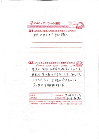 お車のご相談・ 査定だけでもOK! カンタン 入力 30秒 アップルがブランド買取始めました! お電話でも受付中! 受付時間10:00 ~ 18:30 0120-556-522 お車のご相談・ 査定だけでもOK! カンタン 入力 30秒 アップルがブランド買取始めました! お電話でも受付中! 受付時間10:00 ~ 18:30 0120-556-522 アップルがブランド買取始めました! お電話でも受付中! 受付時間10:00 ~ 18:30 0120-556-522 店舗情報 在庫車 スタッフ紹介 ブログ お客様の声 キャンペーン お得 無料査定 click お客様の声 ご記入日: 2013/08/02 K様 査定の関する知識を教えてくれたり、自社で買い取りできなくてもアドバイスしてくれたり次、何か用事あれば真っ先に利用検討したい。 前へ 次へ お客様の声一覧を見る