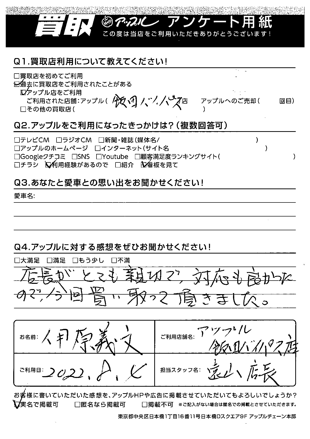 お車のご相談・ 査定だけでもOK! カンタン 入力 30秒 アップルがブランド買取始めました! お電話でも受付中! 受付時間10:00 ~ 19:00 0265-52-4040 お車のご相談・ 査定だけでもOK! カンタン 入力 30秒 アップルがブランド買取始めました! お電話でも受付中! 受付時間10:00 ~ 19:00 0265-52-4040 アップルがブランド買取始めました! お電話でも受付中! 受付時間10:00 ~ 19:00 0265-52-4040 店舗情報 在庫車 スタッフ紹介 ブログ お客様の声 キャンペーン 無料査定 click お客様の声 ご記入日: 2022/08/04 伊原 義文様 Q アップルに対する感想をぜひお聞かせください!店長がとても親切で、対応も良かったので、今回買い取って頂きました。 前へ 次へ お客様の声一覧を見る