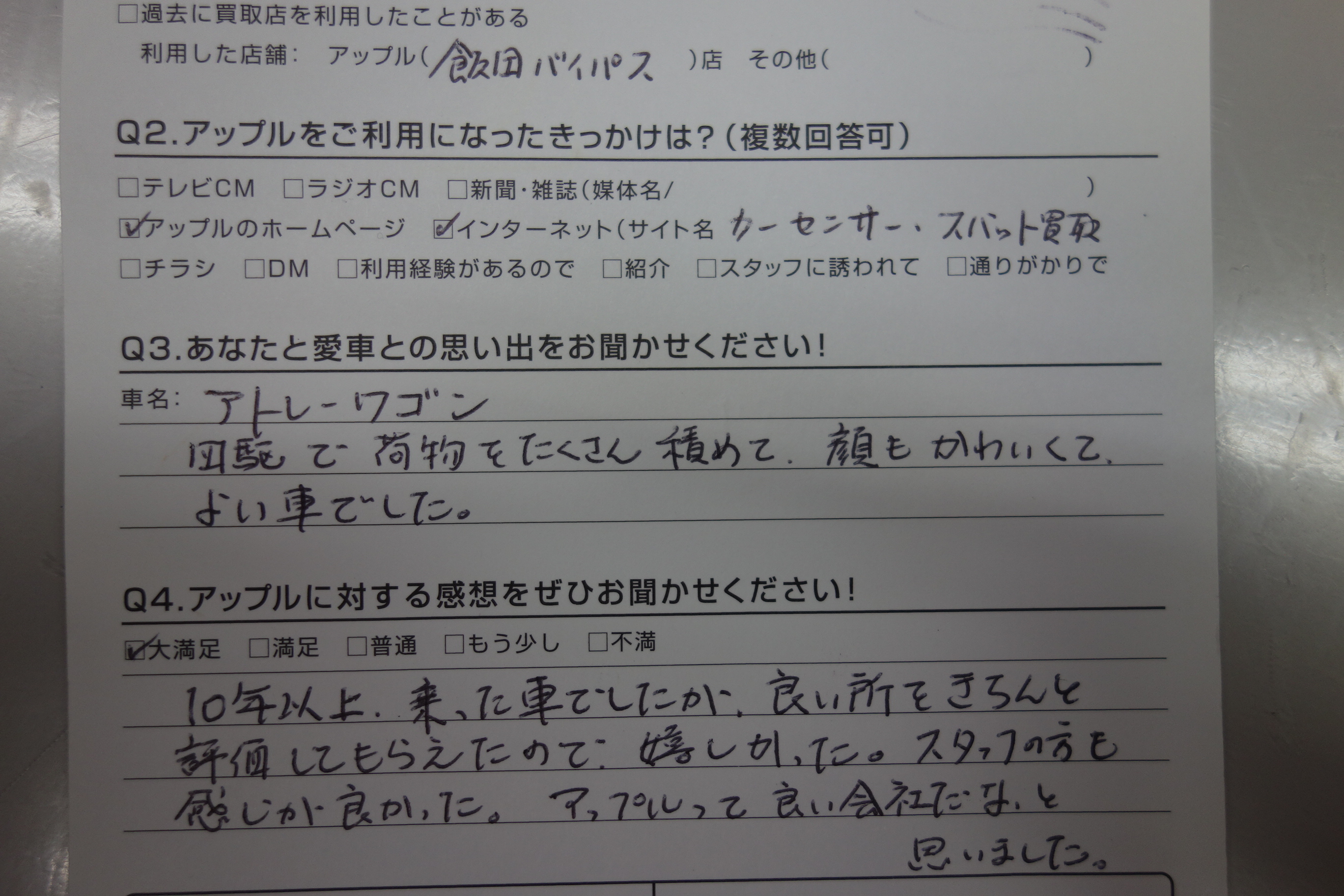10年以上乗った車でしたが、良い所をきちんと評価してもらえたので、嬉しかった。スタッフの方も感じがよかった。アップルって良い会社だな思いました。