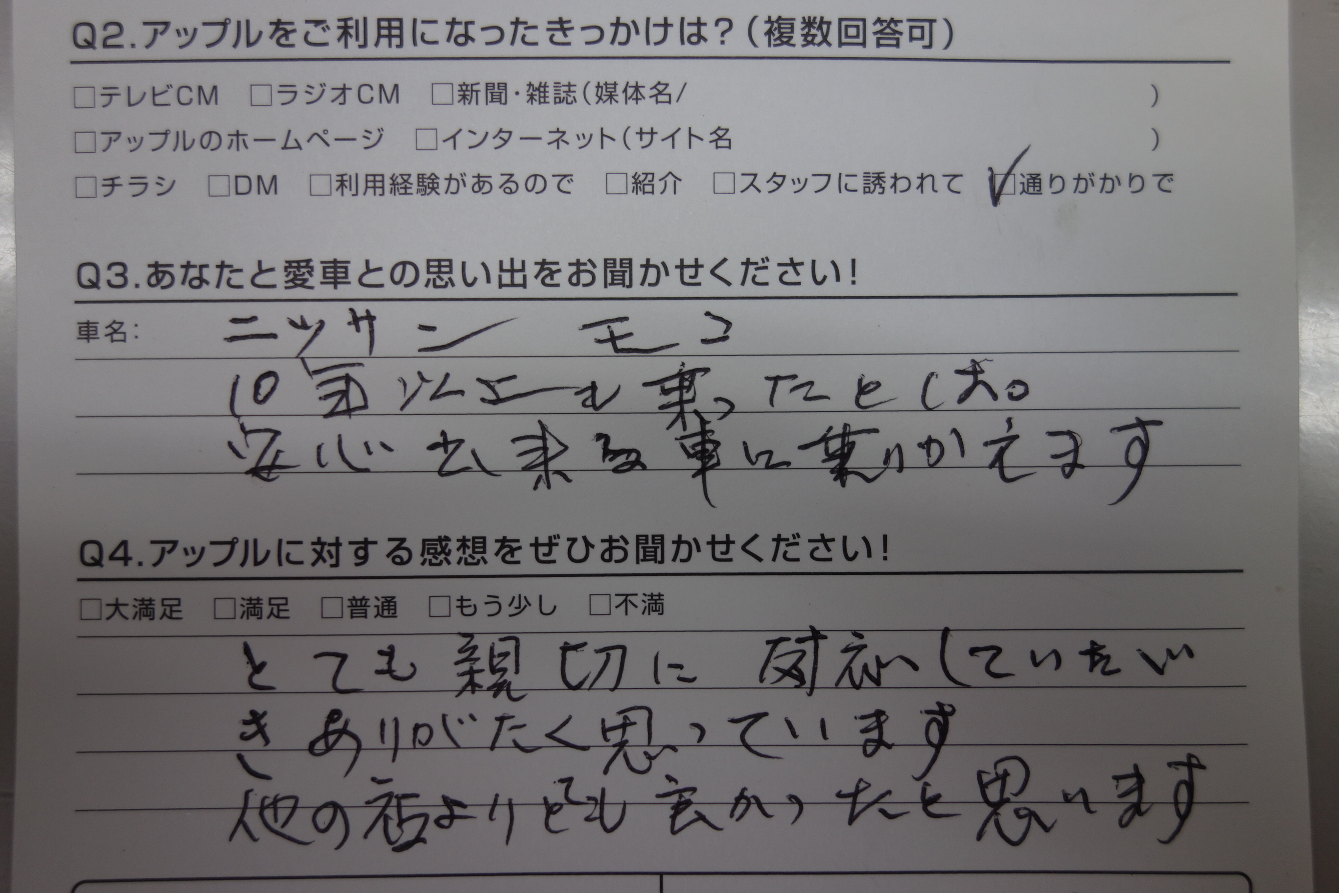 お車のご相談・ 査定だけでもOK! カンタン 入力 30秒 アップルがブランド買取始めました! お電話でも受付中! 受付時間10:00 ~ 19:00 0265-52-4040 お車のご相談・ 査定だけでもOK! カンタン 入力 30秒 アップルがブランド買取始めました! お電話でも受付中! 受付時間10:00 ~ 19:00 0265-52-4040 アップルがブランド買取始めました! お電話でも受付中! 受付時間10:00 ~ 19:00 0265-52-4040 店舗情報 在庫車 スタッフ紹介 ブログ お客様の声 キャンペーン 無料査定 click お客様の声 ご記入日: 2019/09/25 長野県飯田市 匿名希望M様 車名:日産 モコ 10年以上乗ったとは。安心出来る車に乗り換えます。とても親切に対応していただきありがたく思っています。他の店よりとても良かったと思います。 前へ 次へ お客様の声一覧を見る