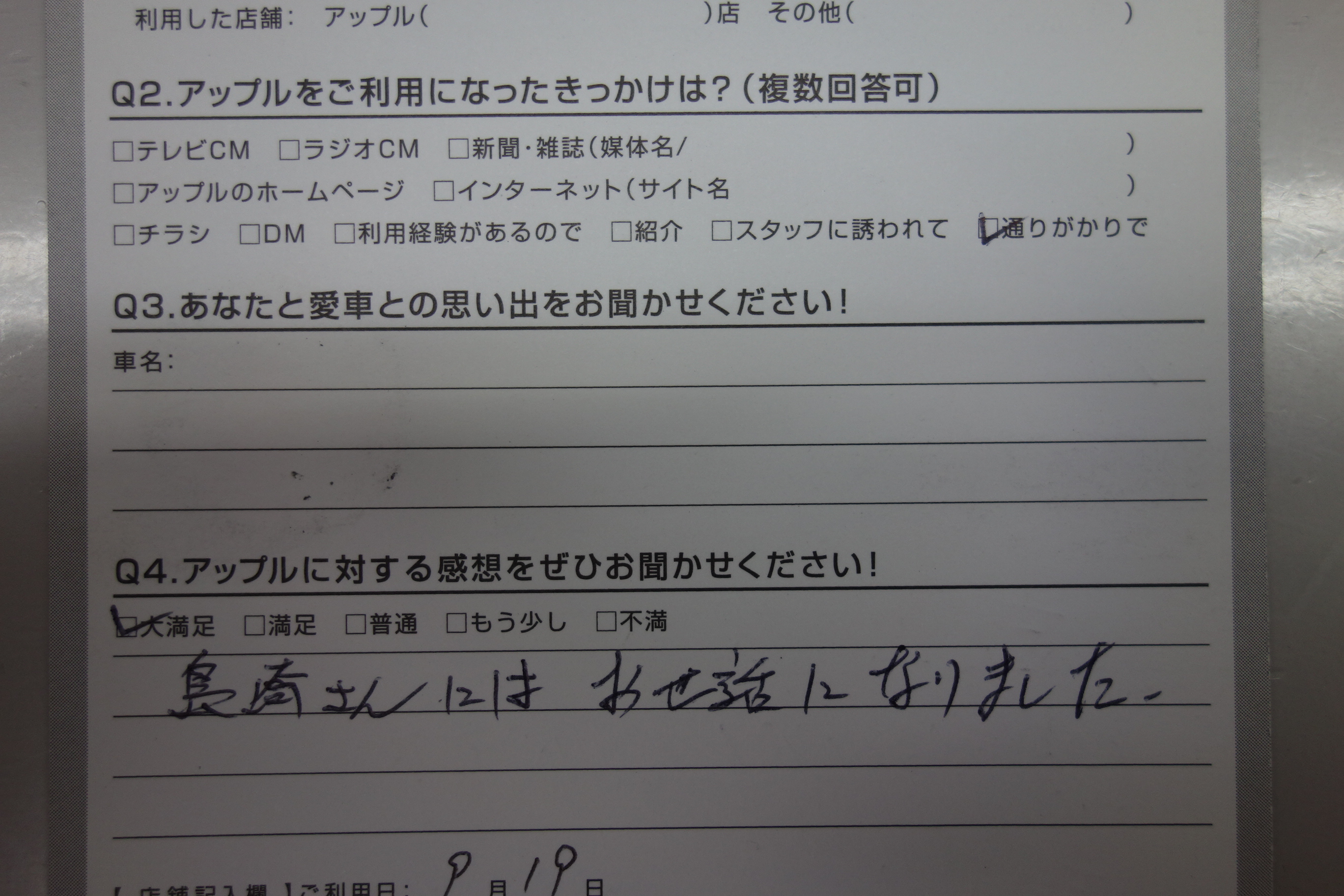 お車のご相談・ 査定だけでもOK! カンタン 入力 30秒 アップルがブランド買取始めました! お電話でも受付中! 受付時間10:00 ~ 19:00 0265-52-4040 お車のご相談・ 査定だけでもOK! カンタン 入力 30秒 アップルがブランド買取始めました! お電話でも受付中! 受付時間10:00 ~ 19:00 0265-52-4040 アップルがブランド買取始めました! お電話でも受付中! 受付時間10:00 ~ 19:00 0265-52-4040 店舗情報 在庫車 スタッフ紹介 ブログ お客様の声 キャンペーン 無料査定 click お客様の声 ご記入日: 2019/09/19 長野県飯田市 匿名希望Y様 車名:ホンダ バモス 島崎さんにはお世話になりました。 前へ 次へ お客様の声一覧を見る