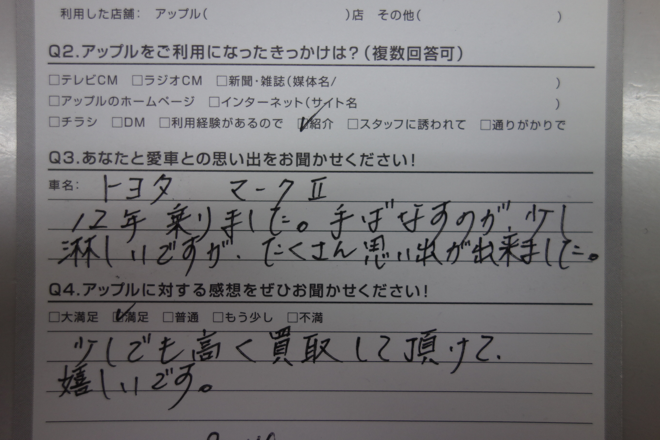 お車のご相談・ 査定だけでもOK! カンタン 入力 30秒 アップルがブランド買取始めました! お電話でも受付中! 受付時間10:00 ~ 19:00 0265-52-4040 お車のご相談・ 査定だけでもOK! カンタン 入力 30秒 アップルがブランド買取始めました! お電話でも受付中! 受付時間10:00 ~ 19:00 0265-52-4040 アップルがブランド買取始めました! お電話でも受付中! 受付時間10:00 ~ 19:00 0265-52-4040 店舗情報 在庫車 スタッフ紹介 ブログ お客様の声 キャンペーン 無料査定 click お客様の声 ご記入日: 2019/09/14 長野県飯田市 匿名希望O様 車名:トヨタ マークⅡハードトップ&H12年10月~セダン 12年乗りました。手放すのが少し淋しいですが、たくさん思い出が出来ました。少しでも高く買取して頂けて、嬉しいです。 前へ 次へ お客様の声一覧を見る