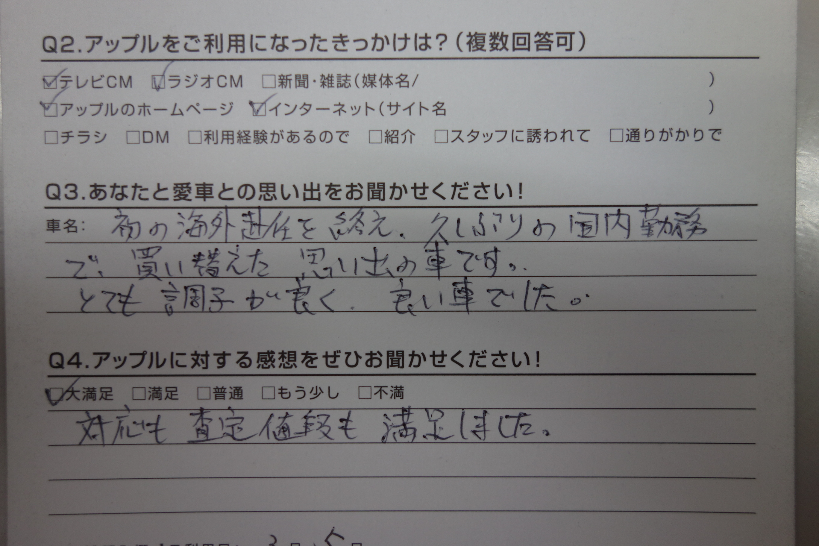 お車のご相談・ 査定だけでもOK! カンタン 入力 30秒 アップルがブランド買取始めました! お電話でも受付中! 受付時間10:00 ~ 19:00 0265-52-4040 お車のご相談・ 査定だけでもOK! カンタン 入力 30秒 アップルがブランド買取始めました! お電話でも受付中! 受付時間10:00 ~ 19:00 0265-52-4040 アップルがブランド買取始めました! お電話でも受付中! 受付時間10:00 ~ 19:00 0265-52-4040 店舗情報 在庫車 スタッフ紹介 ブログ お客様の声 キャンペーン 無料査定 click お客様の声 ご記入日: 2017/03/05 長野県飯田市 匿名希望H様 車名:日産 デュアリス 初の海外赴任を終え、久しぶりの国内勤務で、買い替えた思い出の車です。とても調子が良く、よい車でした。対応も査定値段も満足しました。 前へ 次へ お客様の声一覧を見る