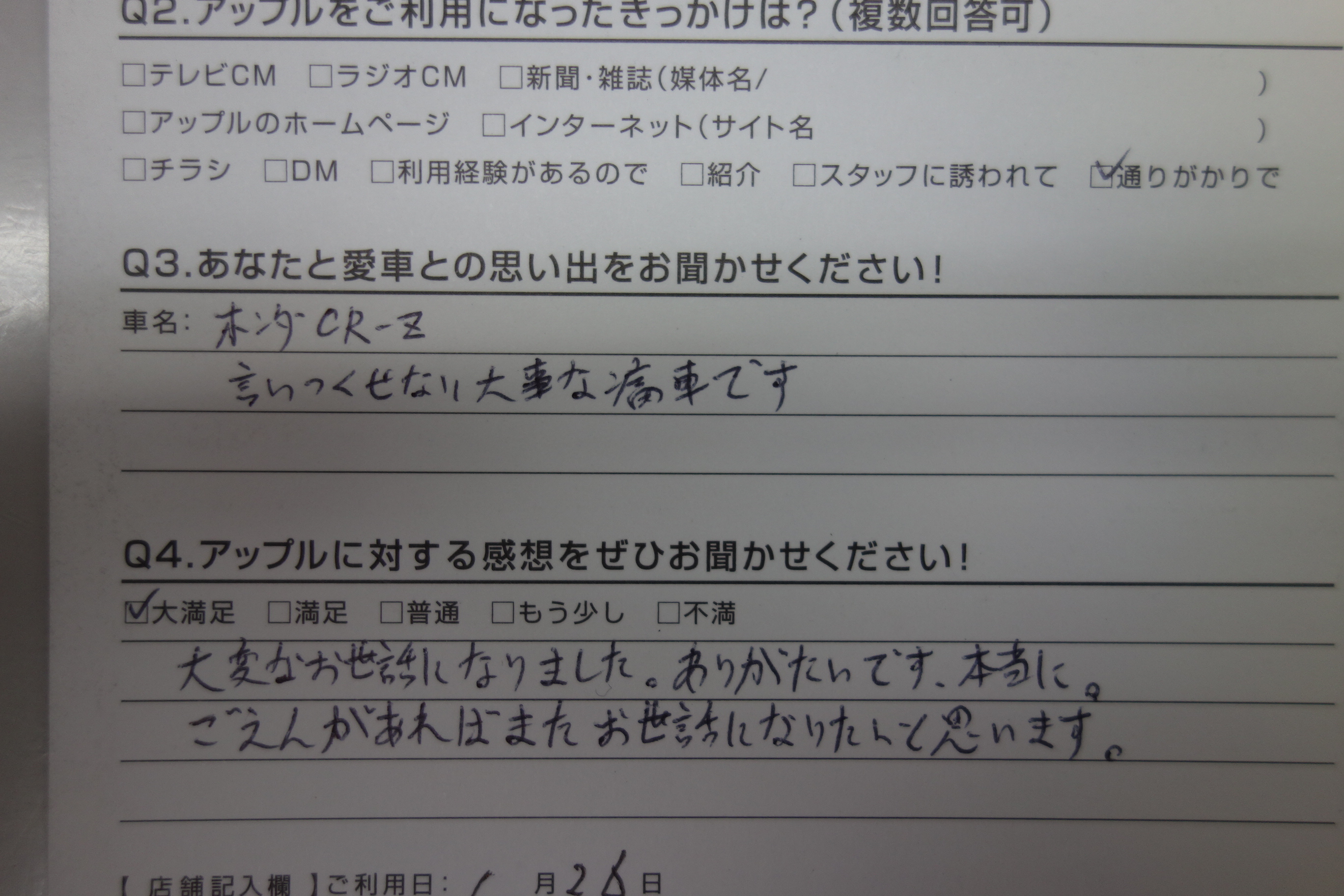 お車のご相談・ 査定だけでもOK! カンタン 入力 30秒 アップルがブランド買取始めました! お電話でも受付中! 受付時間10:00 ~ 19:00 0265-52-4040 お車のご相談・ 査定だけでもOK! カンタン 入力 30秒 アップルがブランド買取始めました! お電話でも受付中! 受付時間10:00 ~ 19:00 0265-52-4040 アップルがブランド買取始めました! お電話でも受付中! 受付時間10:00 ~ 19:00 0265-52-4040 店舗情報 在庫車 スタッフ紹介 ブログ お客様の声 キャンペーン 無料査定 click お客様の声 ご記入日: 2017/01/26 長野県飯田市 石橋 孝章様 車名:ホンダ CR-Z 言いつくせない大事な痛車です大変お世話になりました。ありがたいです、本当に。ごえんがあればまたお世話になりたいと思います。 前へ 次へ お客様の声一覧を見る