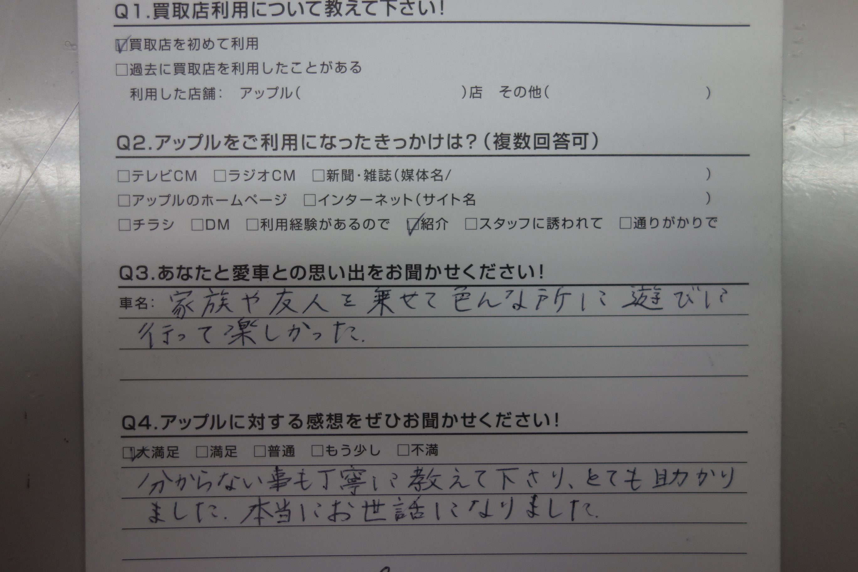 お車のご相談・ 査定だけでもOK! カンタン 入力 30秒 アップルがブランド買取始めました! お電話でも受付中! 受付時間10:00 ~ 19:00 0265-52-4040 お車のご相談・ 査定だけでもOK! カンタン 入力 30秒 アップルがブランド買取始めました! お電話でも受付中! 受付時間10:00 ~ 19:00 0265-52-4040 アップルがブランド買取始めました! お電話でも受付中! 受付時間10:00 ~ 19:00 0265-52-4040 店舗情報 在庫車 スタッフ紹介 ブログ お客様の声 キャンペーン 無料査定 click お客様の声 ご記入日: 2017/02/19 長野県飯田市 匿名希望N様 車名:トヨタ ヴィッツ 家族や友人を乗せて色んな所に遊びに行って楽しかった。分からない事も丁寧に教えて下さり、とても助かりました。本当にお世話になりました。 前へ 次へ お客様の声一覧を見る