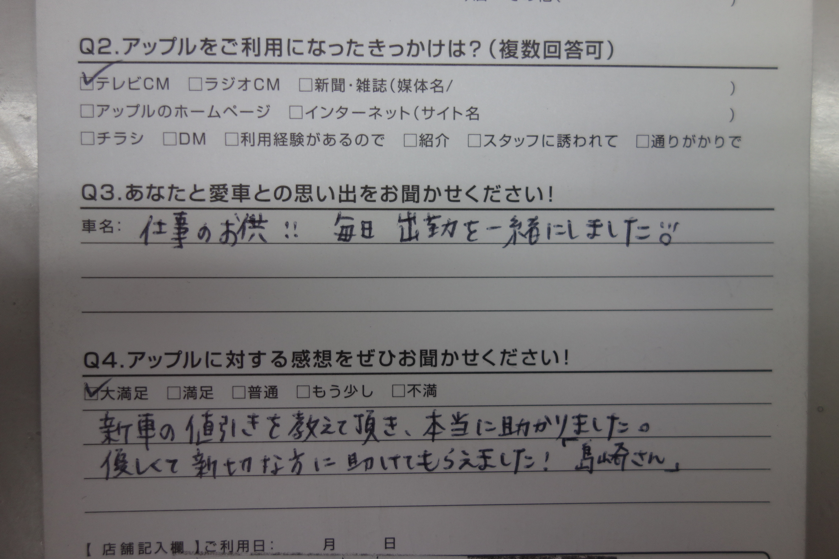 お車のご相談・ 査定だけでもOK! カンタン 入力 30秒 アップルがブランド買取始めました! お電話でも受付中! 受付時間10:00 ~ 19:00 0265-52-4040 お車のご相談・ 査定だけでもOK! カンタン 入力 30秒 アップルがブランド買取始めました! お電話でも受付中! 受付時間10:00 ~ 19:00 0265-52-4040 アップルがブランド買取始めました! お電話でも受付中! 受付時間10:00 ~ 19:00 0265-52-4040 店舗情報 在庫車 スタッフ紹介 ブログ お客様の声 キャンペーン 無料査定 click お客様の声 ご記入日: 2017/02/01 長野県飯田市 匿名希望K様 車名:日産 モコ 仕事のお供!!毎日出勤を一緒にしました!新車の値引きを教えて頂き、本当に助かりました。優しくて親切な方に助けてもらえました!「島崎さん」 前へ 次へ お客様の声一覧を見る