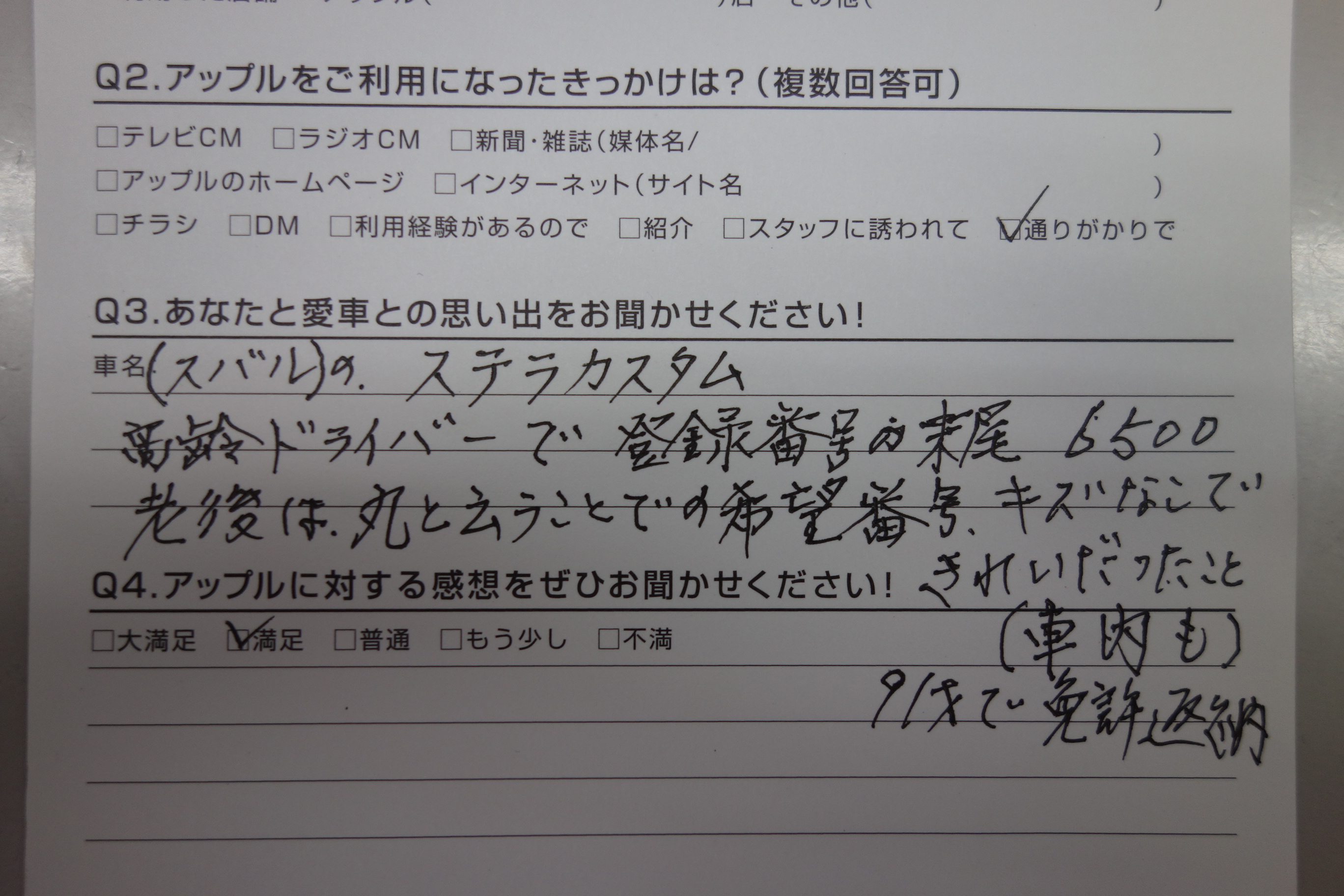 お車のご相談・ 査定だけでもOK! カンタン 入力 30秒 アップルがブランド買取始めました! お電話でも受付中! 受付時間10:00 ~ 19:00 0265-52-4040 お車のご相談・ 査定だけでもOK! カンタン 入力 30秒 アップルがブランド買取始めました! お電話でも受付中! 受付時間10:00 ~ 19:00 0265-52-4040 アップルがブランド買取始めました! お電話でも受付中! 受付時間10:00 ~ 19:00 0265-52-4040 店舗情報 在庫車 スタッフ紹介 ブログ お客様の声 キャンペーン 無料査定 click お客様の声 ご記入日: 2019/07/27 長野県松川町 匿名希望K様 車名:スバル ステラ 高齢ドライバーで登録番号の末尾6500老後は丸と云うことでの希望番号。キズなしできれいだったこと。(車内も)91才で免許返納 前へ 次へ お客様の声一覧を見る