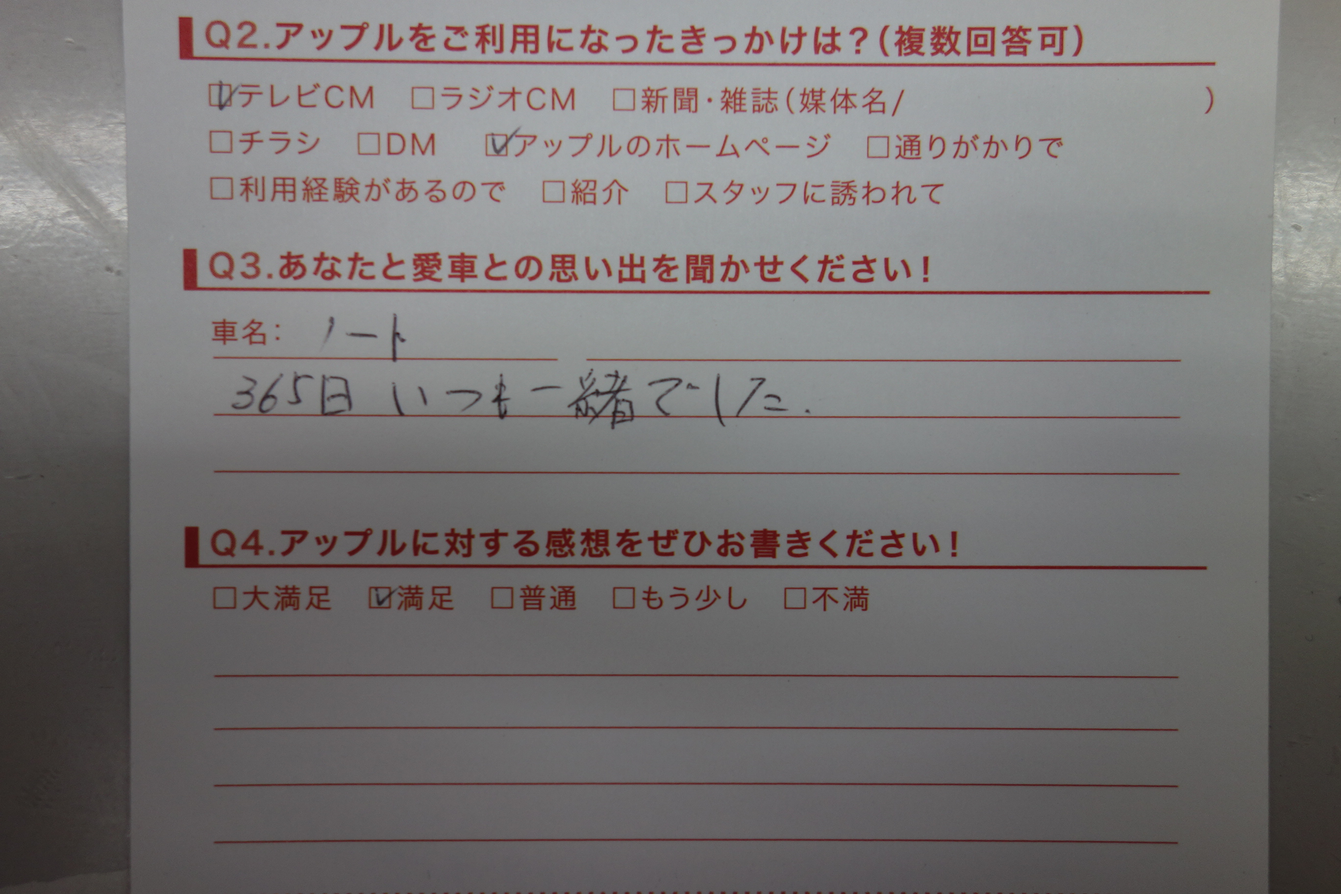 お車のご相談・ 査定だけでもOK! カンタン 入力 30秒 アップルがブランド買取始めました! お電話でも受付中! 受付時間10:00 ~ 19:00 0265-52-4040 お車のご相談・ 査定だけでもOK! カンタン 入力 30秒 アップルがブランド買取始めました! お電話でも受付中! 受付時間10:00 ~ 19:00 0265-52-4040 アップルがブランド買取始めました! お電話でも受付中! 受付時間10:00 ~ 19:00 0265-52-4040 店舗情報 在庫車 スタッフ紹介 ブログ お客様の声 キャンペーン 無料査定 click お客様の声 ご記入日: 2014/02/10 匿名希望O様様 車名:日産 ノート 365日いつも一緒でした。 前へ 次へ お客様の声一覧を見る