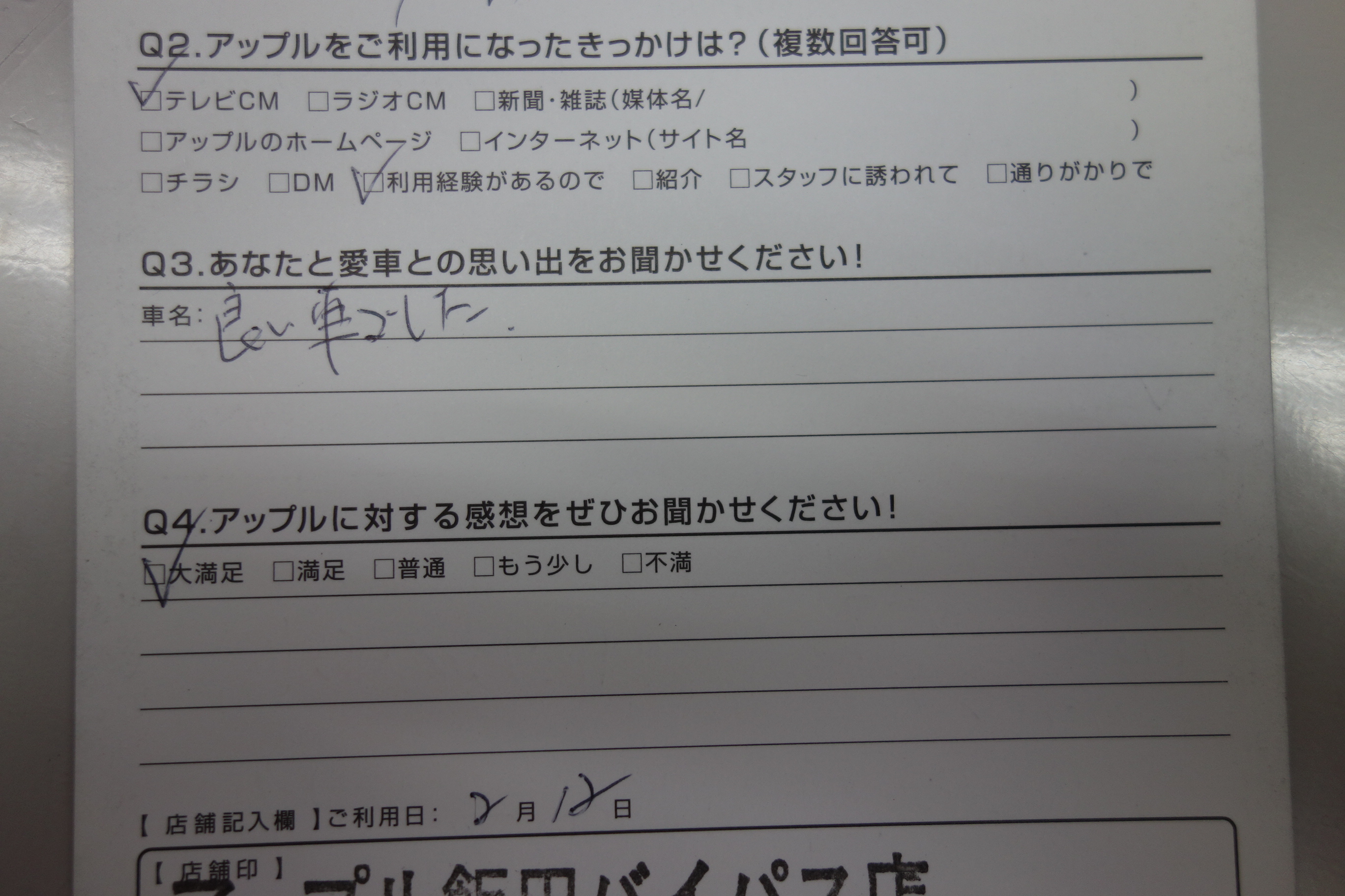 お車のご相談・ 査定だけでもOK! カンタン 入力 30秒 アップルがブランド買取始めました! お電話でも受付中! 受付時間10:00 ~ 19:00 0265-52-4040 お車のご相談・ 査定だけでもOK! カンタン 入力 30秒 アップルがブランド買取始めました! お電話でも受付中! 受付時間10:00 ~ 19:00 0265-52-4040 アップルがブランド買取始めました! お電話でも受付中! 受付時間10:00 ~ 19:00 0265-52-4040 店舗情報 在庫車 スタッフ紹介 ブログ お客様の声 キャンペーン 無料査定 click お客様の声 ご記入日: 2017/02/12 長野県豊丘村 匿名希望K様 車名:スズキ MRワゴン 良い車でした。 前へ 次へ お客様の声一覧を見る