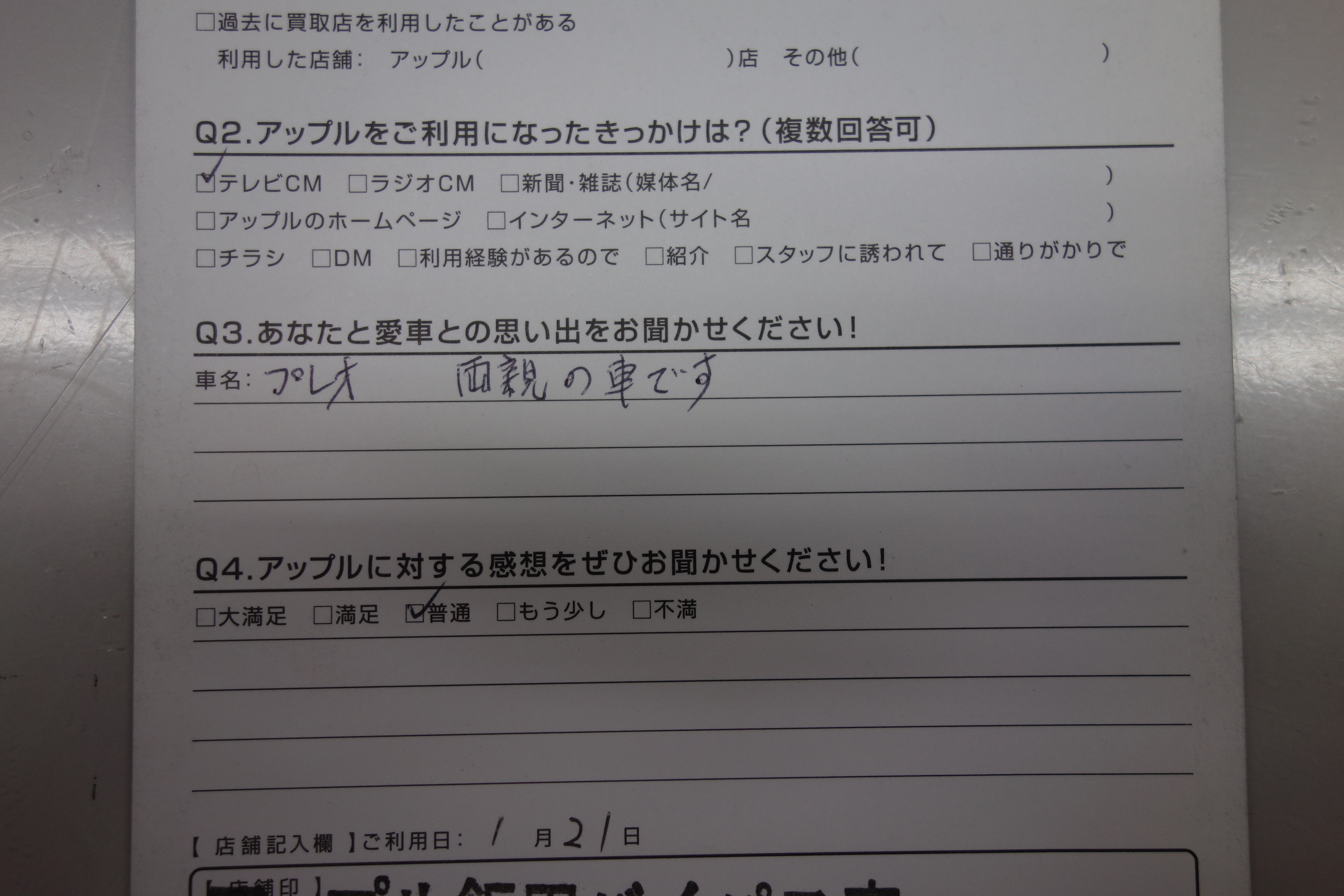 お車のご相談・ 査定だけでもOK! カンタン 入力 30秒 アップルがブランド買取始めました! お電話でも受付中! 受付時間10:00 ~ 19:00 0265-52-4040 お車のご相談・ 査定だけでもOK! カンタン 入力 30秒 アップルがブランド買取始めました! お電話でも受付中! 受付時間10:00 ~ 19:00 0265-52-4040 アップルがブランド買取始めました! お電話でも受付中! 受付時間10:00 ~ 19:00 0265-52-4040 店舗情報 在庫車 スタッフ紹介 ブログ お客様の声 キャンペーン 無料査定 click お客様の声 ご記入日: 2017/01/21 長野県豊丘村 匿名希望K様 車名:スバル プレオ 両親の車です。 前へ 次へ お客様の声一覧を見る