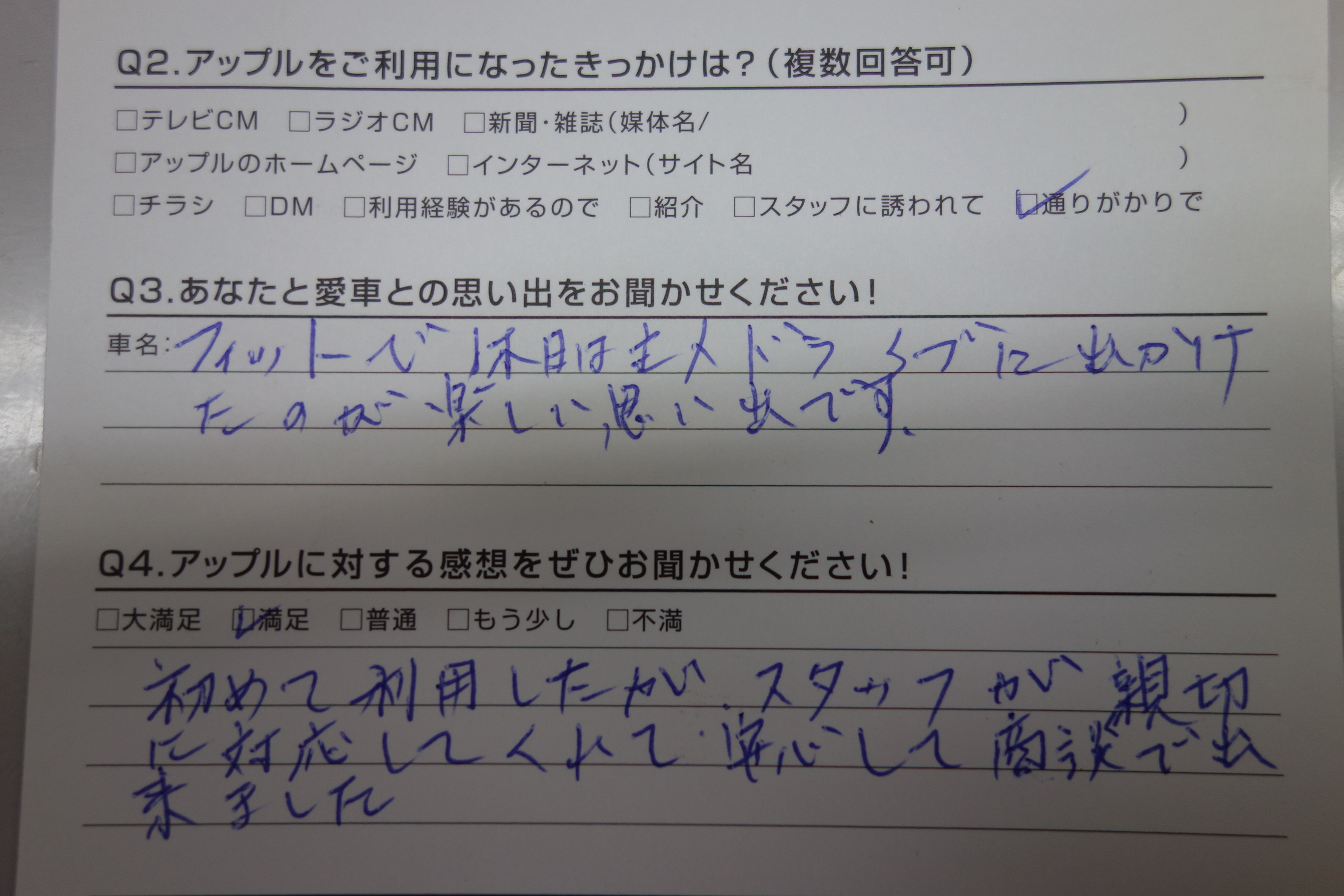 お車のご相談・ 査定だけでもOK! カンタン 入力 30秒 アップルがブランド買取始めました! お電話でも受付中! 受付時間10:00 ~ 19:00 0265-52-4040 お車のご相談・ 査定だけでもOK! カンタン 入力 30秒 アップルがブランド買取始めました! お電話でも受付中! 受付時間10:00 ~ 19:00 0265-52-4040 アップルがブランド買取始めました! お電話でも受付中! 受付時間10:00 ~ 19:00 0265-52-4040 店舗情報 在庫車 スタッフ紹介 ブログ お客様の声 キャンペーン 無料査定 click お客様の声 ご記入日: 2019/02/20 匿名希望I様 車名:ホンダ フィット(H25年9月以降のハイブリッド含む) フィットで休日は主にドライブに出かけたのが楽しい思い出です。初めて利用したが、スタッフが親切に対応してくれて、安心して商談出来ました。 前へ 次へ お客様の声一覧を見る