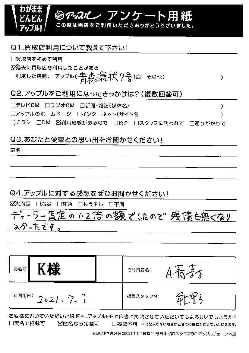 スーパーアップル青森店 お車のご相談・ 査定だけでもOK! カンタン 入力 30秒 アップルがブランド買取始めました! お電話でも受付中! 受付時間9:30 ~ 18:00 017-761-5589 お車のご相談・ 査定だけでもOK! カンタン 入力 30秒 アップルがブランド買取始めました! お電話でも受付中! 受付時間9:30 ~ 18:00 017-761-5589 アップルがブランド買取始めました! お電話でも受付中! 受付時間9:30 ~ 18:00 017-761-5589 店舗情報 在庫車 スタッフ紹介 ブログ お客様の声 キャンペーン 無料査定 click お客様の声 ご記入日: 2021/07/02 K様 Q:アップルに対する感想をぜひお聞かせください!大満足ディーラー査定の1.2倍の額でしたので残債も無くなりよかったです。 前へ 次へ お客様の声一覧を見る