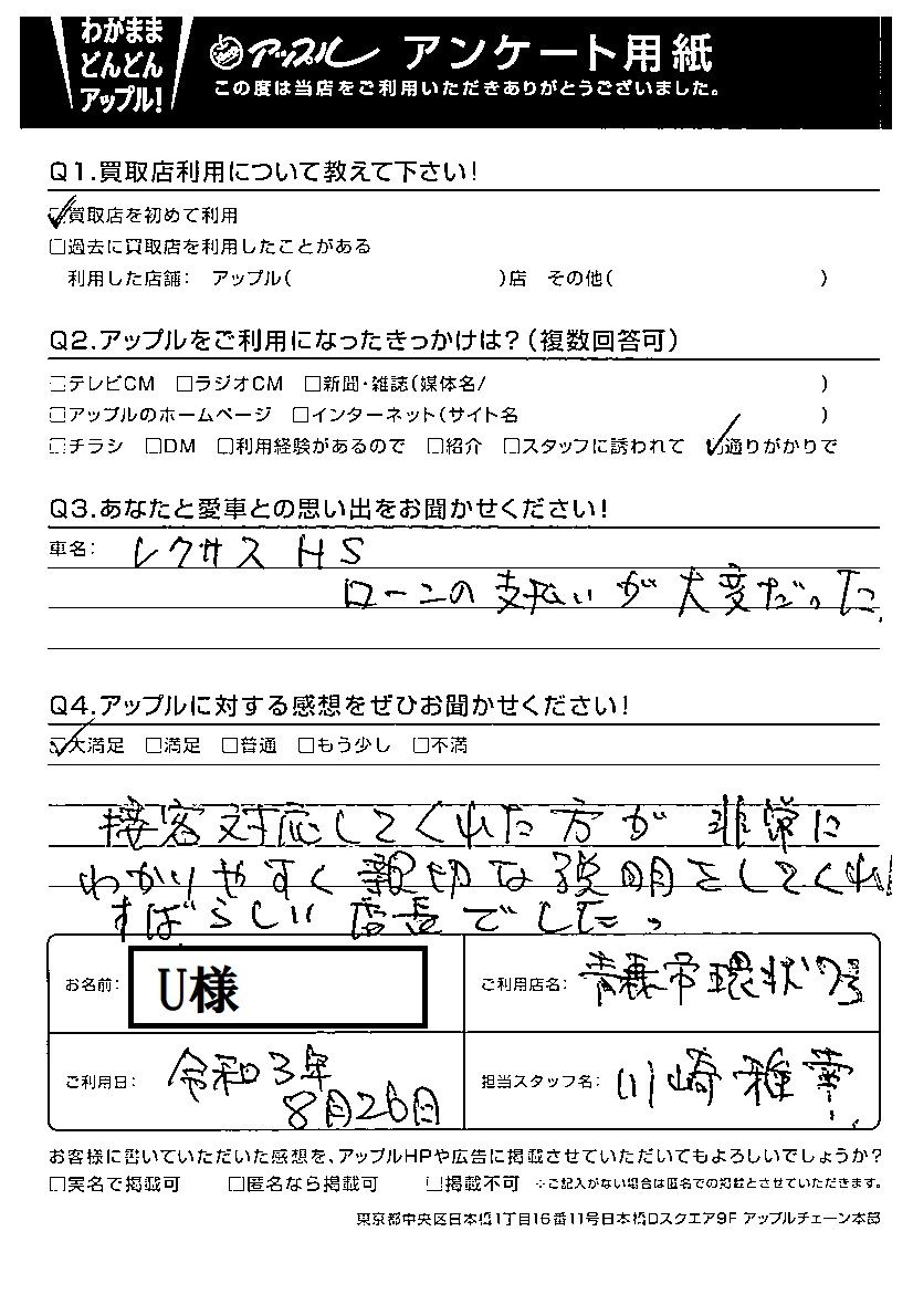 U様 車名:レクサス HS (国内仕様 右H)