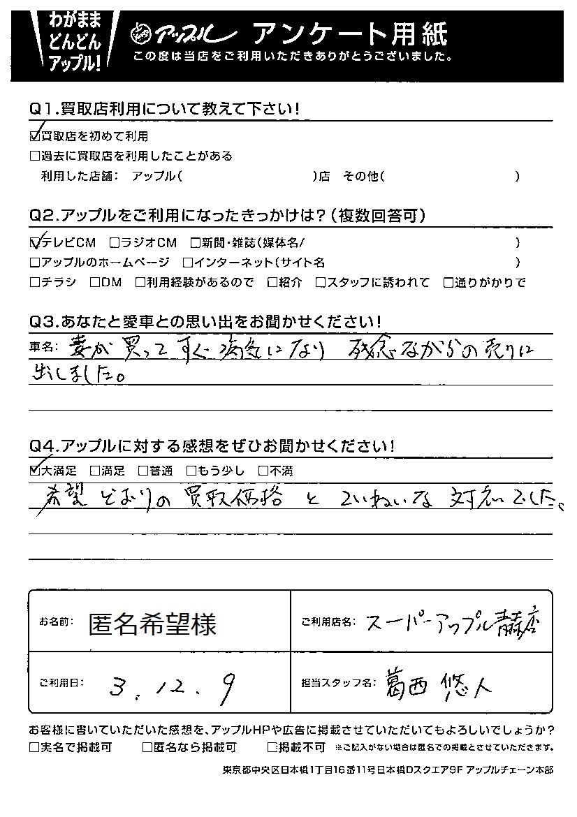 スーパーアップル青森店 お車のご相談・ 査定だけでもOK! カンタン 入力 30秒 アップルがブランド買取始めました! お電話でも受付中! 受付時間9:30 ~ 18:00 017-761-5589 お車のご相談・ 査定だけでもOK! カンタン 入力 30秒 アップルがブランド買取始めました! お電話でも受付中! 受付時間9:30 ~ 18:00 017-761-5589 アップルがブランド買取始めました! お電話でも受付中! 受付時間9:30 ~ 18:00 017-761-5589 店舗情報 在庫車 スタッフ紹介 ブログ お客様の声 キャンペーン 無料査定 click お客様の声 ご記入日: 2021/12/09 匿名希望様 Q:あなたと愛車との思い出をお聞かせください!妻が買ってすぐ病気になり残念ながら売りに出しました。Q:アップルに対する感想をぜひお聞かせください!希望どおりの買取価格とていねいな対応でした。 前へ 次へ お客様の声一覧を見る