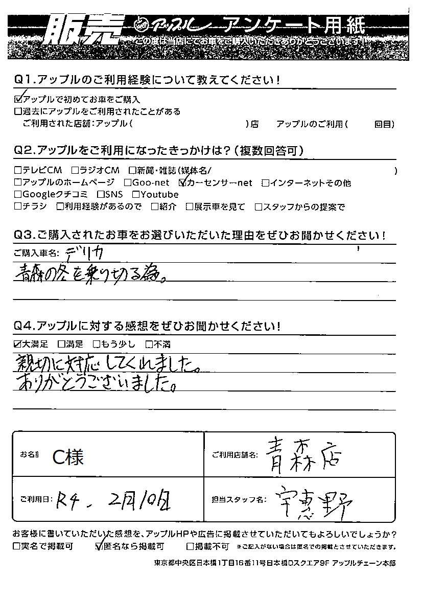 スーパーアップル青森店 お車のご相談・ 査定だけでもOK! カンタン 入力 30秒 アップルがブランド買取始めました! お電話でも受付中! 受付時間9:30 ~ 18:00 017-761-5589 お車のご相談・ 査定だけでもOK! カンタン 入力 30秒 アップルがブランド買取始めました! お電話でも受付中! 受付時間9:30 ~ 18:00 017-761-5589 アップルがブランド買取始めました! お電話でも受付中! 受付時間9:30 ~ 18:00 017-761-5589 店舗情報 在庫車 スタッフ紹介 ブログ お客様の声 キャンペーン 無料査定 click お客様の声 ご記入日: 2022/02/10 C様 車名:三菱 Q あなたと愛車との思い出をお聞かせください!青森の冬を乗り切る為Q アップルに対する感想をぜひお聞かせください!感想:大満足親切に対応してくれました。ありがとうございました。 前へ 次へ お客様の声一覧を見る