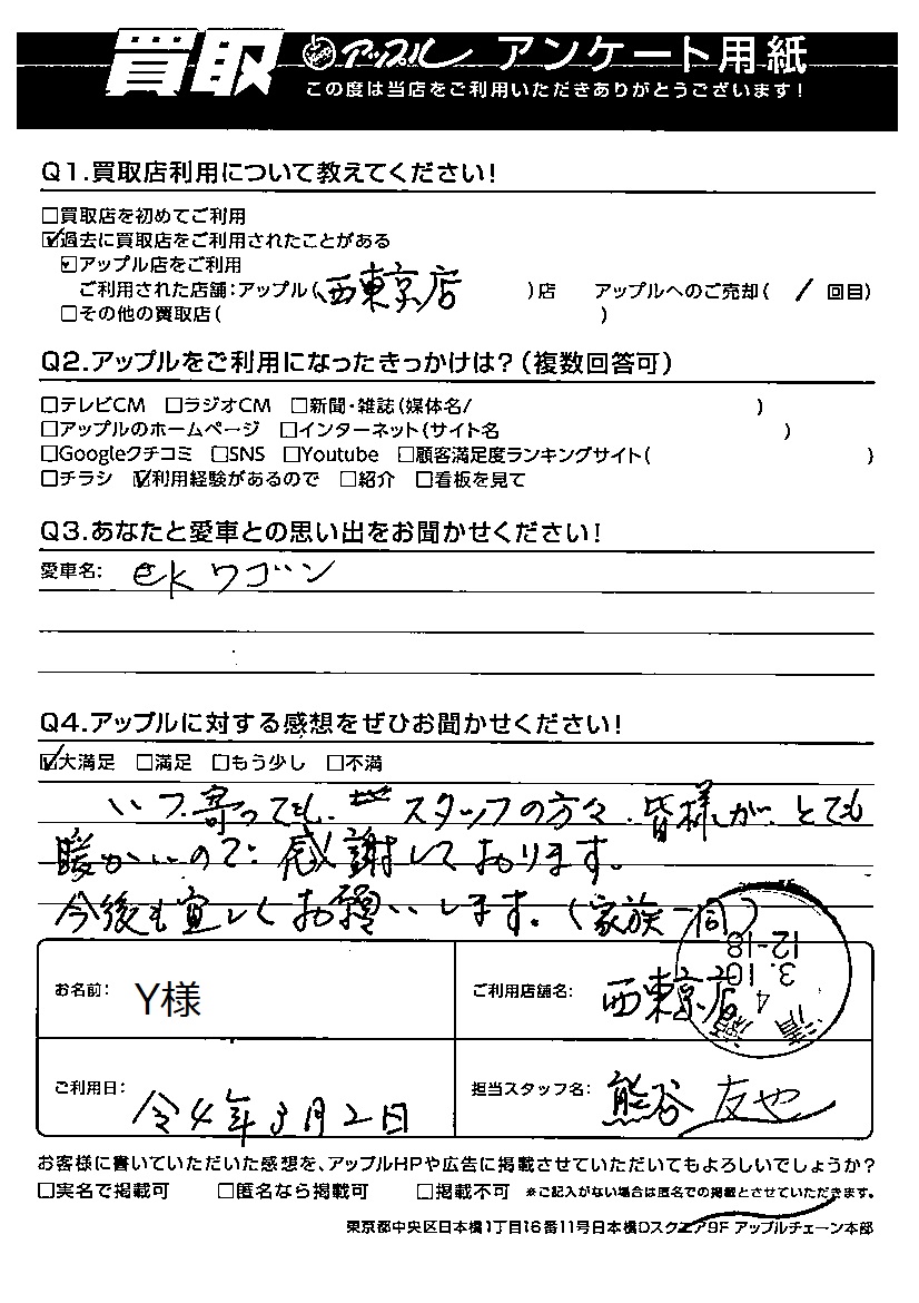 スーパーアップル青森店 お車のご相談・ 査定だけでもOK! カンタン 入力 30秒 アップルがブランド買取始めました! お電話でも受付中! 受付時間9:30 ~ 18:00 017-761-5589 お車のご相談・ 査定だけでもOK! カンタン 入力 30秒 アップルがブランド買取始めました! お電話でも受付中! 受付時間9:30 ~ 18:00 017-761-5589 アップルがブランド買取始めました! お電話でも受付中! 受付時間9:30 ~ 18:00 017-761-5589 店舗情報 在庫車 スタッフ紹介 ブログ お客様の声 キャンペーン 無料査定 click お客様の声 ご記入日: 2022/03/02 Y様 車名:三菱 eKワゴン Q あなたと愛車との思い出をお聞かせください!いつ寄ってもスタッフの方々、皆様がとても暖かいので感謝しております。今後も宜しくお願いします。(家族一同) 前へ 次へ お客様の声一覧を見る