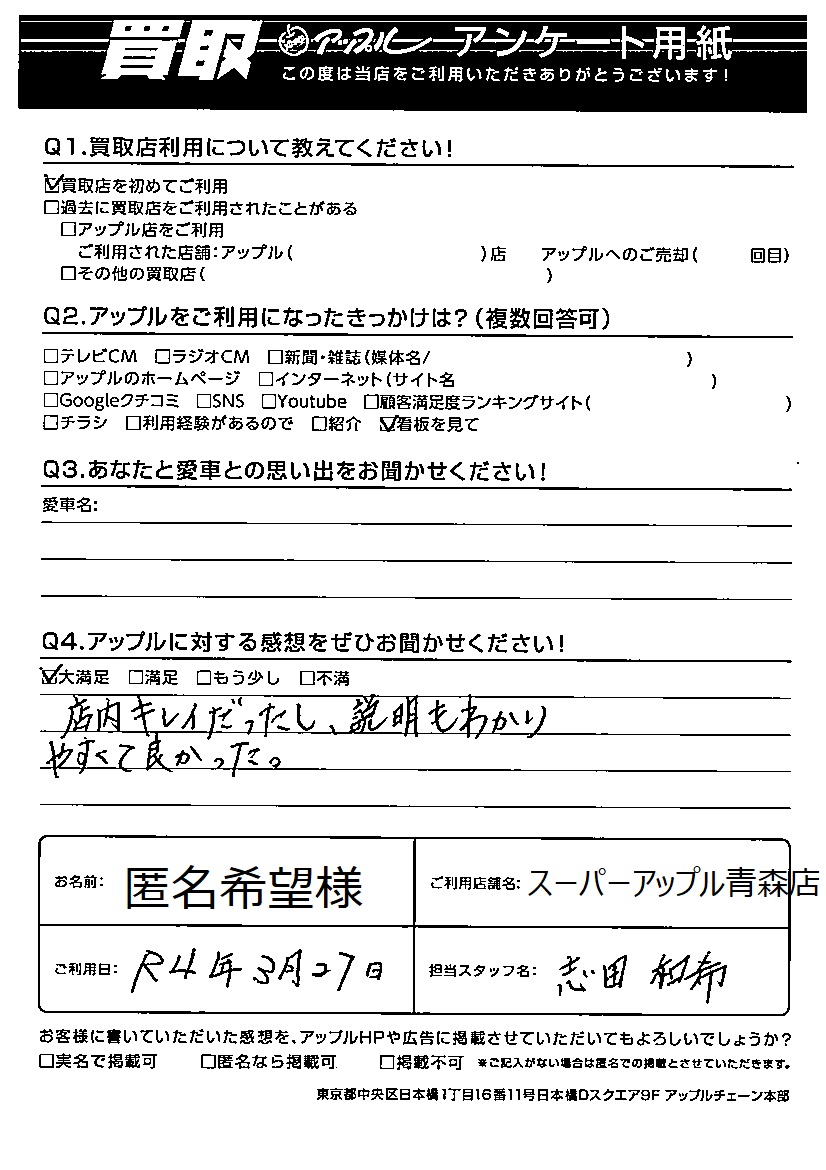 スーパーアップル青森店 お車のご相談・ 査定だけでもOK! カンタン 入力 30秒 アップルがブランド買取始めました! お電話でも受付中! 受付時間9:30 ~ 18:00 017-761-5589 お車のご相談・ 査定だけでもOK! カンタン 入力 30秒 アップルがブランド買取始めました! お電話でも受付中! 受付時間9:30 ~ 18:00 017-761-5589 アップルがブランド買取始めました! お電話でも受付中! 受付時間9:30 ~ 18:00 017-761-5589 店舗情報 在庫車 スタッフ紹介 ブログ お客様の声 キャンペーン 無料査定 click お客様の声 ご記入日: 2022/03/27 匿名希望様 Q アップルに対する感想をぜひお聞かせください!感想:大満足店内キレイだったし、説明もわかりやすくて良かった。 前へ 次へ お客様の声一覧を見る