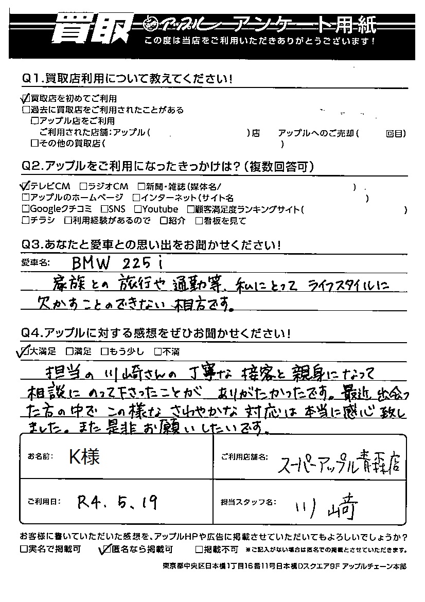 K様 車名:BMW 2シリーズアクティブツアラー