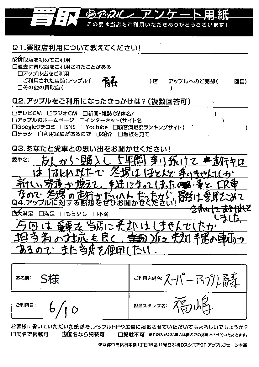 今回は愛車を当店に売却はしませんでしたが、担当者の対応も良く、近々売却予定の車両があるので、また当店を使用したい。