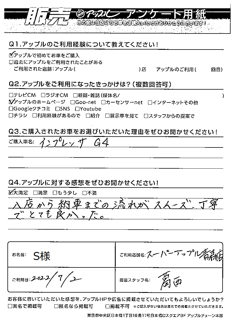 スーパーアップル青森店 お車のご相談・ 査定だけでもOK! カンタン 入力 30秒 アップルがブランド買取始めました! お電話でも受付中! 受付時間9:30 ~ 18:00 017-761-5589 お車のご相談・ 査定だけでもOK! カンタン 入力 30秒 アップルがブランド買取始めました! お電話でも受付中! 受付時間9:30 ~ 18:00 017-761-5589 アップルがブランド買取始めました! お電話でも受付中! 受付時間9:30 ~ 18:00 017-761-5589 店舗情報 在庫車 スタッフ紹介 ブログ お客様の声 キャンペーン 無料査定 click お客様の声 ご記入日: 2022/07/02 S様 車名:スバル インプレッサG4 Q アップルに対する感想をぜひお聞かせください!感想:大満足八戸から納車までの流れがスムーズ、丁寧でとても良かった。 前へ 次へ お客様の声一覧を見る