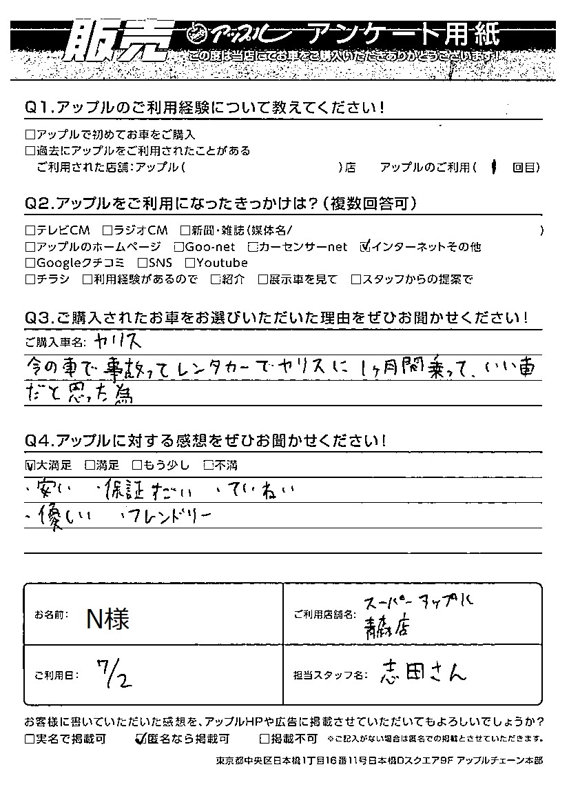 N様 車名:トヨタ ヤリス