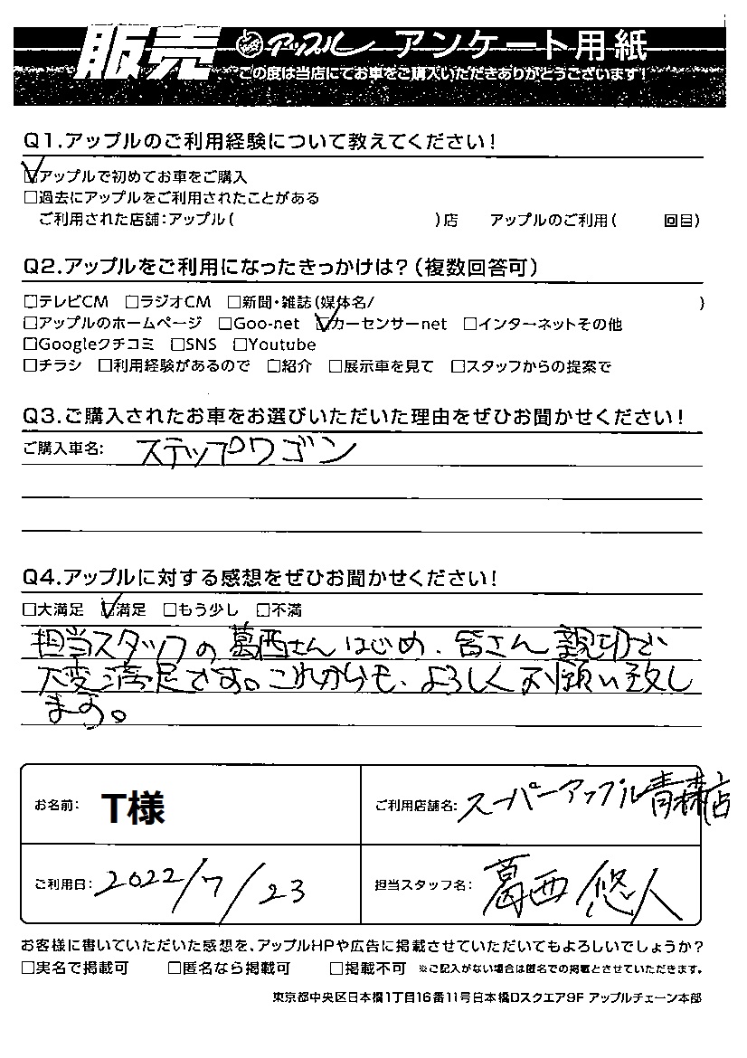 スーパーアップル青森店 お車のご相談・ 査定だけでもOK! カンタン 入力 30秒 アップルがブランド買取始めました! お電話でも受付中! 受付時間9:30 ~ 18:00 017-761-5589 お車のご相談・ 査定だけでもOK! カンタン 入力 30秒 アップルがブランド買取始めました! お電話でも受付中! 受付時間9:30 ~ 18:00 017-761-5589 アップルがブランド買取始めました! お電話でも受付中! 受付時間9:30 ~ 18:00 017-761-5589 店舗情報 在庫車 スタッフ紹介 ブログ お客様の声 キャンペーン 無料査定 click お客様の声 ご記入日: 2022/07/23 T様 車名:ホンダ ステップワゴン Q アップルに対する感想をぜひお聞かせください!感想:満足担当スタッフの葛西さんはじめ、皆さん親切で大変満足です。これからもよろしくお願い致します。 前へ 次へ お客様の声一覧を見る