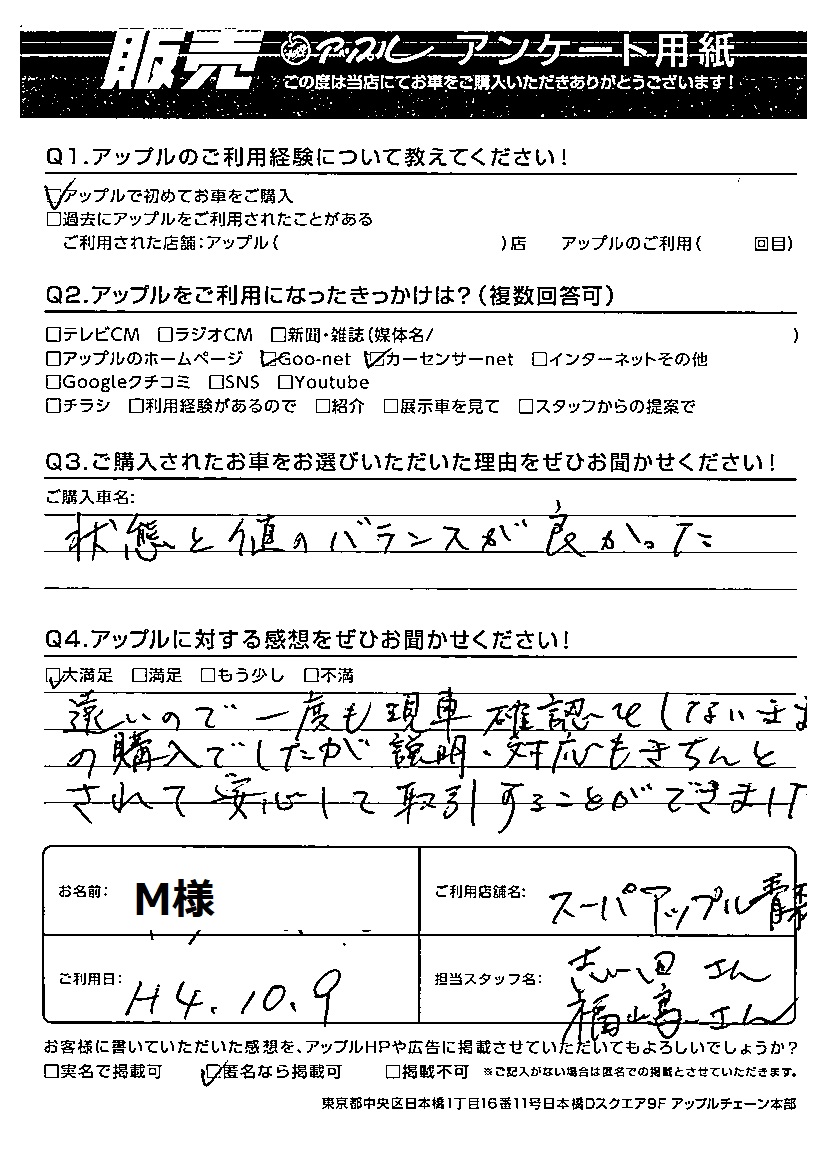 遠いので一度も現車確認をしないままの購入でしたが、説明・対応もきちんとされて安心して取引することができました。