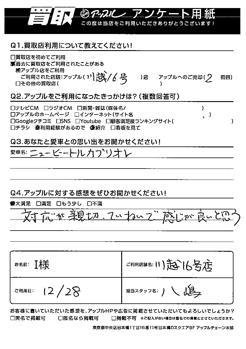 お車のご相談・ 査定だけでもOK! カンタン 入力 30秒 アップルがブランド買取始めました! お電話でも受付中! 受付時間AM10:00~PM7:00 049-244-4855 お車のご相談・ 査定だけでもOK! カンタン 入力 30秒 アップルがブランド買取始めました! お電話でも受付中! 受付時間AM10:00~PM7:00 049-244-4855 アップルがブランド買取始めました! お電話でも受付中! 受付時間AM10:00~PM7:00 049-244-4855 店舗情報 在庫車 スタッフ紹介 ブログ お客様の声 キャンペーン 無料査定 click お客様の声 ご記入日: 2021/12/28 I様 車名:フォルクスワーゲン ニュービートルカブリオレ Q アップルに対する感想をぜひお聞かせください!感想:大満足対応が親切、ていねいで感じが良いと思う。 前へ 次へ お客様の声一覧を見る