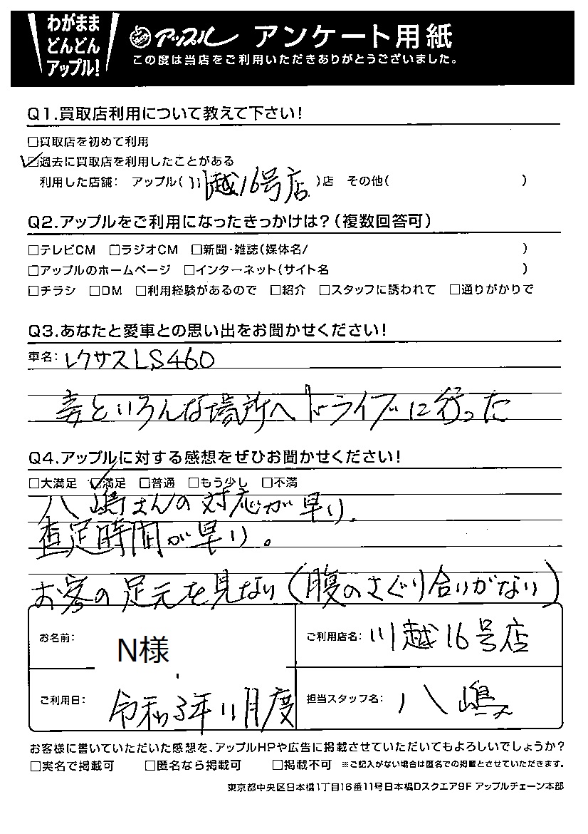 N様 車名:レクサス LS (国内仕様 右H H29年10月~HYBRID含)