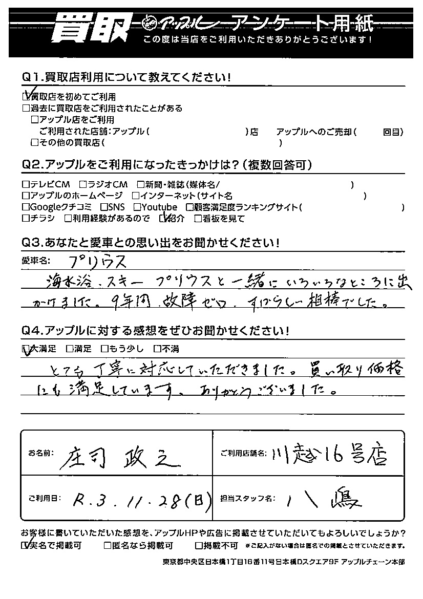 庄司 政之様 車名:トヨタ プリウス(2023年3月~のPHVを含む)