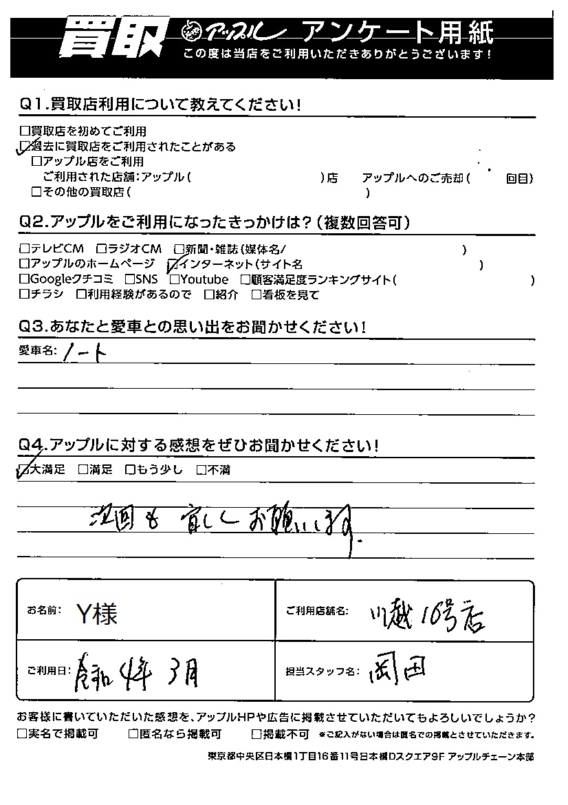 お車のご相談・ 査定だけでもOK! カンタン 入力 30秒 アップルがブランド買取始めました! お電話でも受付中! 受付時間AM10:00~PM7:00 049-244-4855 お車のご相談・ 査定だけでもOK! カンタン 入力 30秒 アップルがブランド買取始めました! お電話でも受付中! 受付時間AM10:00~PM7:00 049-244-4855 アップルがブランド買取始めました! お電話でも受付中! 受付時間AM10:00~PM7:00 049-244-4855 店舗情報 在庫車 スタッフ紹介 ブログ お客様の声 キャンペーン 無料査定 click お客様の声 ご記入日: 2022/03/01 Y様 車名:日産 ノート Q アップルに対する感想をぜひお聞かせください!感想:大満足次回も宜しくお願いします。 前へ 次へ お客様の声一覧を見る