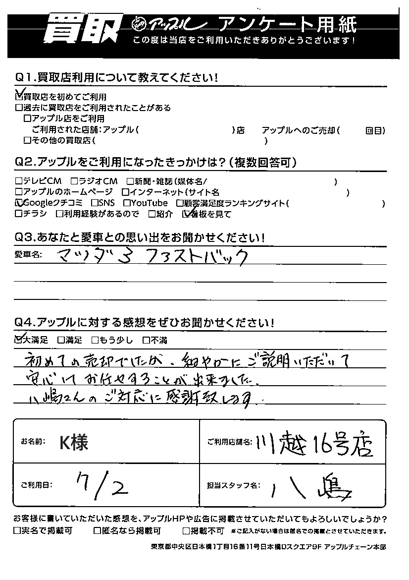お車のご相談・ 査定だけでもOK! カンタン 入力 30秒 アップルがブランド買取始めました! お電話でも受付中! 受付時間AM10:00~PM7:00 049-244-4855 お車のご相談・ 査定だけでもOK! カンタン 入力 30秒 アップルがブランド買取始めました! お電話でも受付中! 受付時間AM10:00~PM7:00 049-244-4855 アップルがブランド買取始めました! お電話でも受付中! 受付時間AM10:00~PM7:00 049-244-4855 店舗情報 在庫車 スタッフ紹介 ブログ お客様の声 キャンペーン 無料査定 click お客様の声 ご記入日: 2023/07/02 K様 車名:マツダ MAZDA3ファストバック Q:アップルに対する感想をぜひお聞かせください!大満足初めての売却でしたが、細やかにご説明いただいて安心してお任せすることが出来ました。八嶋さんのご対応に感謝致します。 前へ 次へ お客様の声一覧を見る