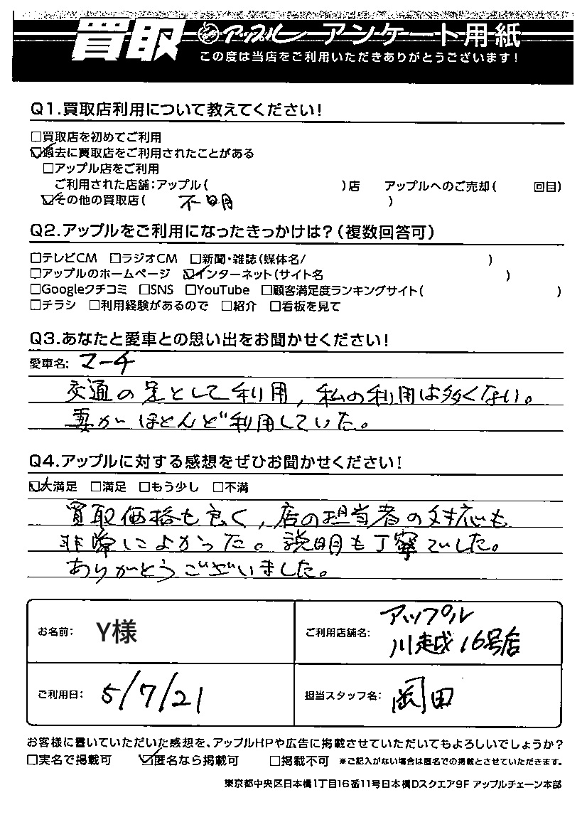 買取価格も良く、店の担当者の対応も非常によかった。説明も丁寧でした。ありがとうございました。