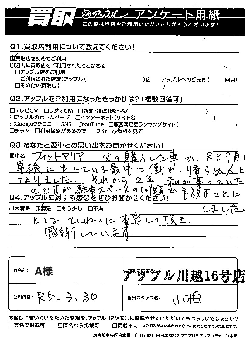 父の購入した車で、R3 7月に車検に出している最中に倒れ、帰らぬ人となりました。それから2年、私が乗っていたのですが、駐車スペースの問題で手放すことにしました。