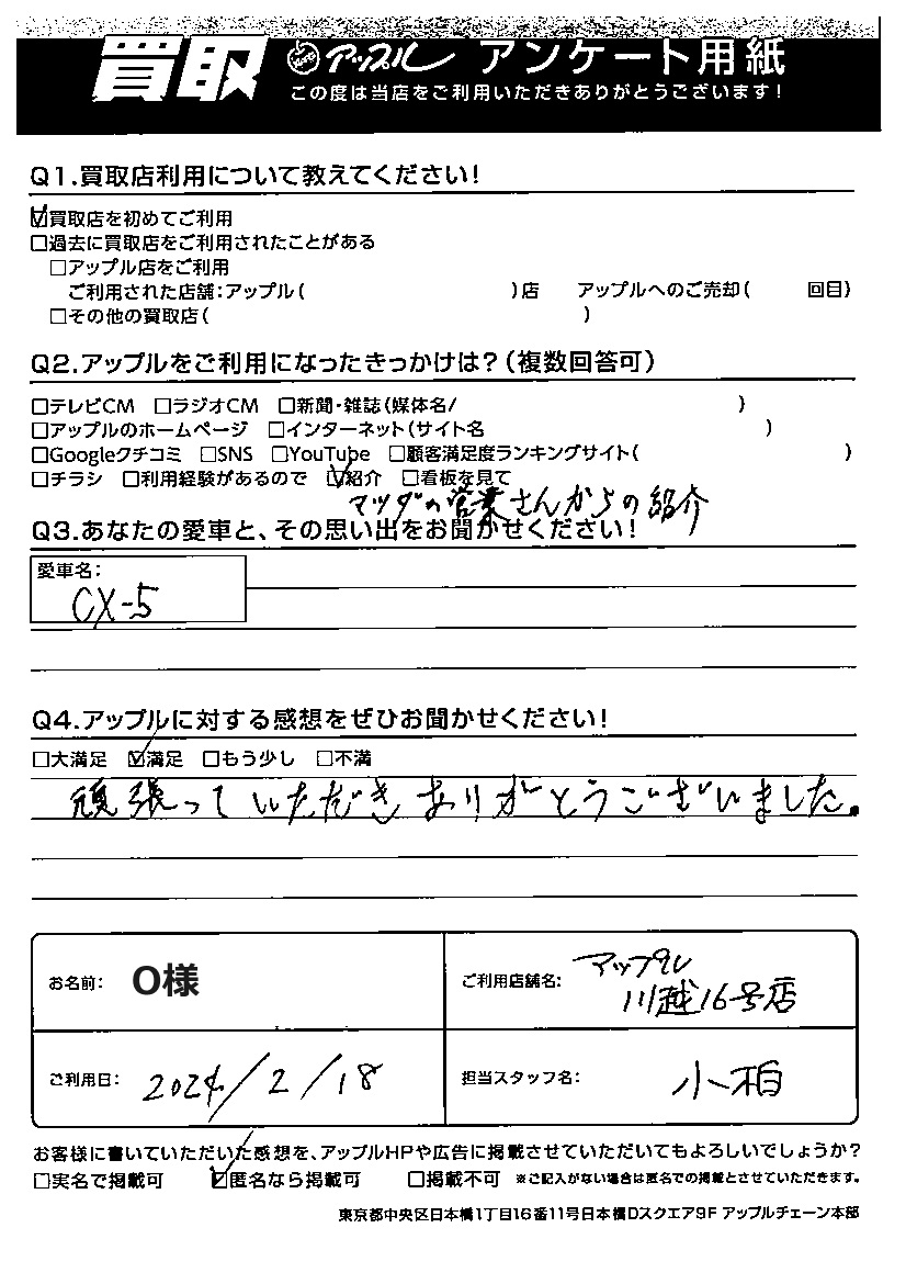 お車のご相談・ 査定だけでもOK! カンタン 入力 30秒 アップルがブランド買取始めました! お電話でも受付中! 受付時間AM10:00~PM7:00 049-244-4855 お車のご相談・ 査定だけでもOK! カンタン 入力 30秒 アップルがブランド買取始めました! お電話でも受付中! 受付時間AM10:00~PM7:00 049-244-4855 アップルがブランド買取始めました! お電話でも受付中! 受付時間AM10:00~PM7:00 049-244-4855 店舗情報 在庫車 スタッフ紹介 ブログ お客様の声 キャンペーン 無料査定 click お客様の声 ご記入日: 2024/02/18 O様 車名:マツダ CX-5 Q:アップルに対する感想をぜひお聞かせください!満足頑張っていただきありがとうございました。 前へ 次へ お客様の声一覧を見る