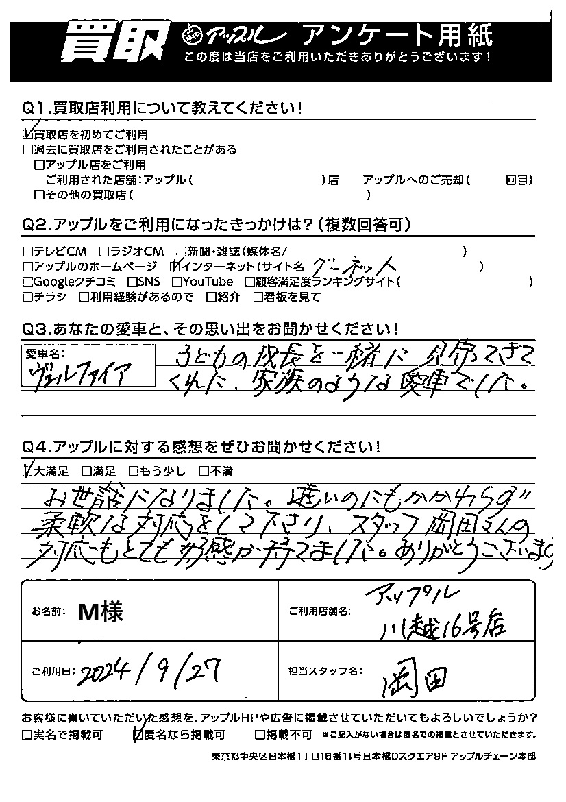 M様 車名:トヨタ ヴェルファイア(H27年1月~のHYBRID含む)