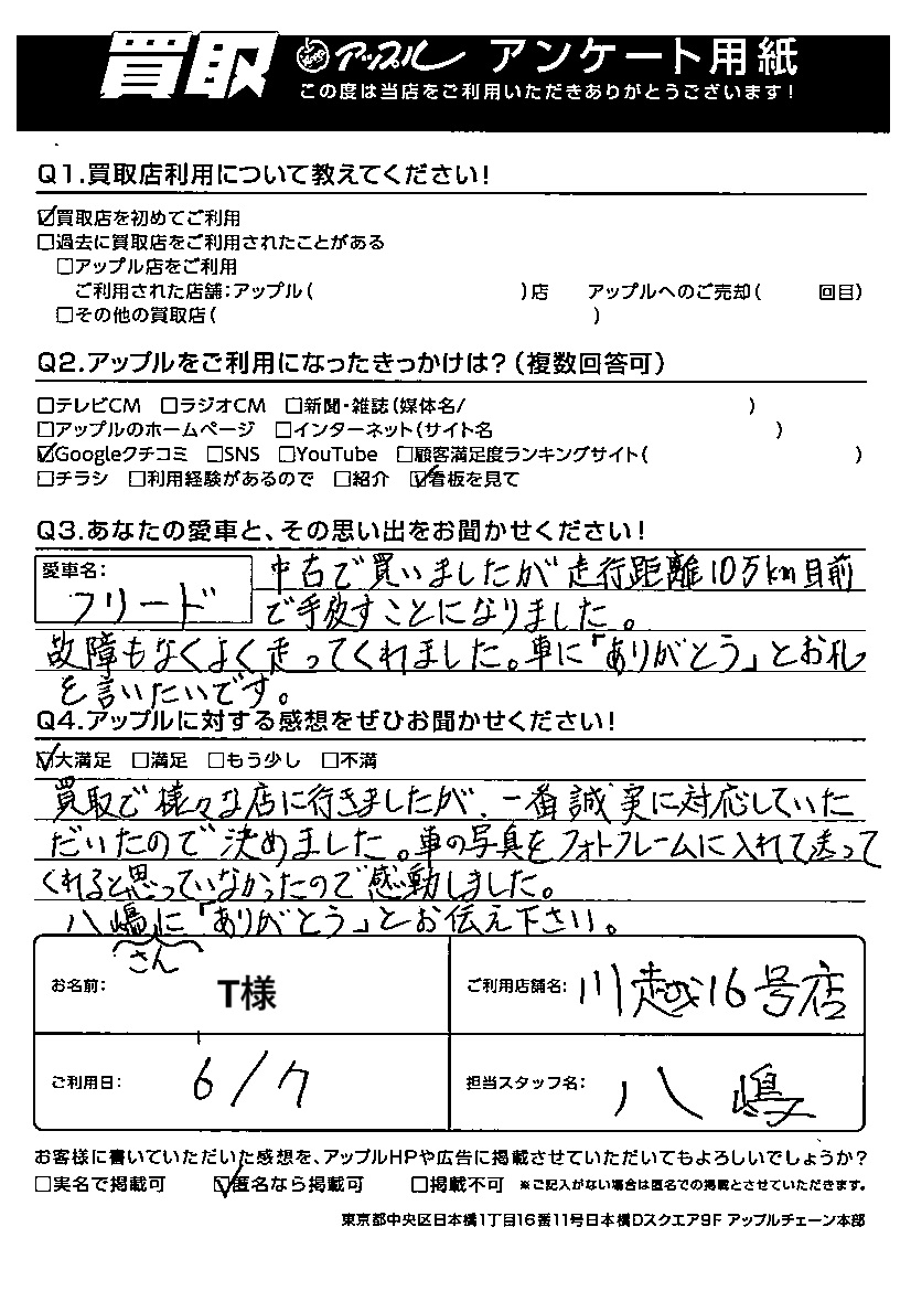 買取で様々な店に行きましたが、一番誠実に対応していただいたので決めました。車の写真をフォトフレームに入れて送ってくれると思っていなかったので感動しました。八嶋さんに「ありがとう」とお伝え下さい。